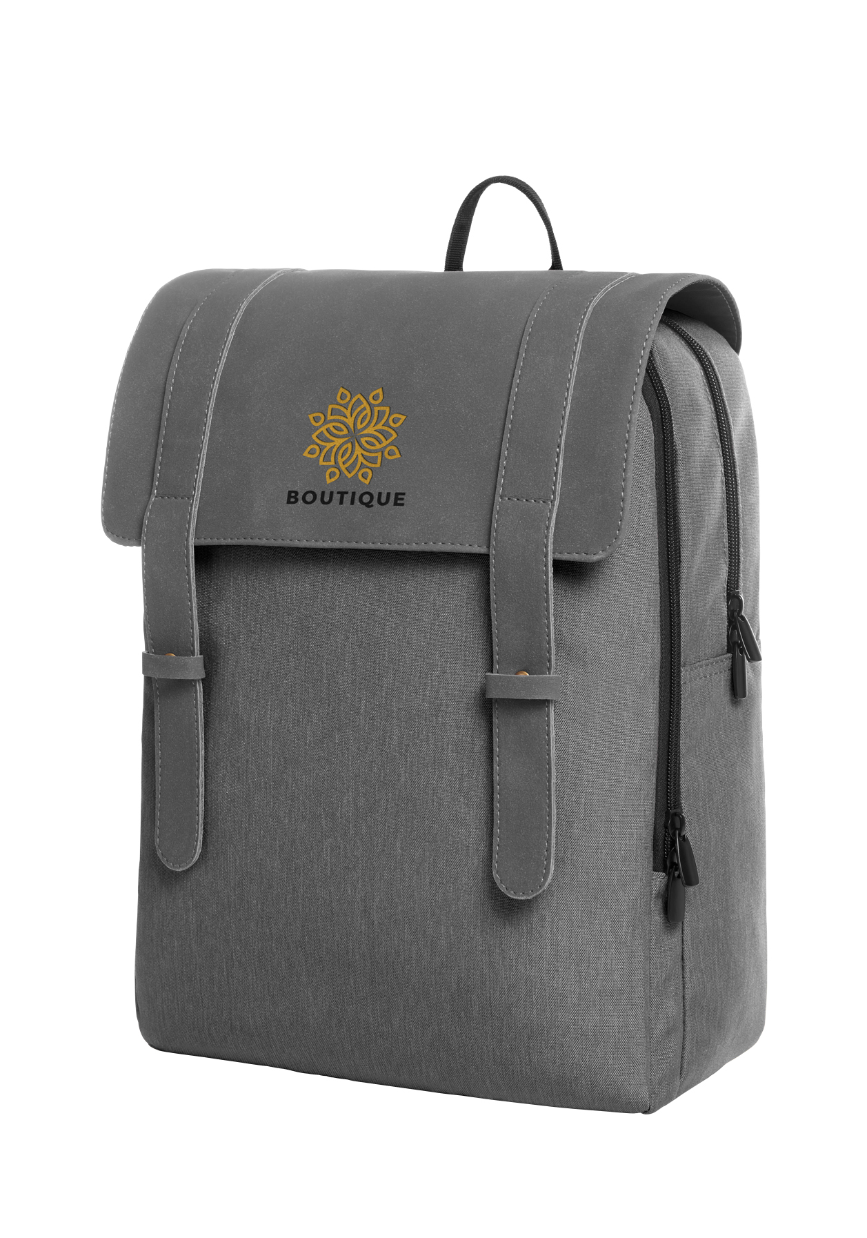 young notebook backpack with trendy, geometric cut; combination of melange fabric and artificial velour leather; main compartment with padded notebook compartment; zipper front pouch with two flat insert pockets; two-way zippers; padded back and shoulder straps