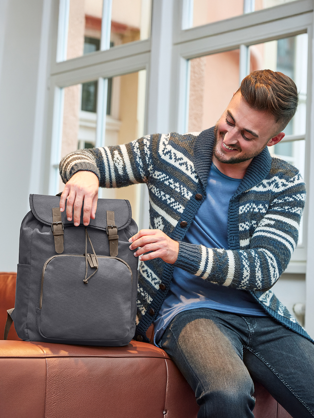 flap with adjustable decorative buckles and magnetic clasp; large main compartment with drawstring fastener; padded notebook compartment; front pocket with 2-way zipper; two flat insert pockets; handle with grip cuff; padded, adjustable shoulder straps; high-quality metal and PU suede faux leather accessories