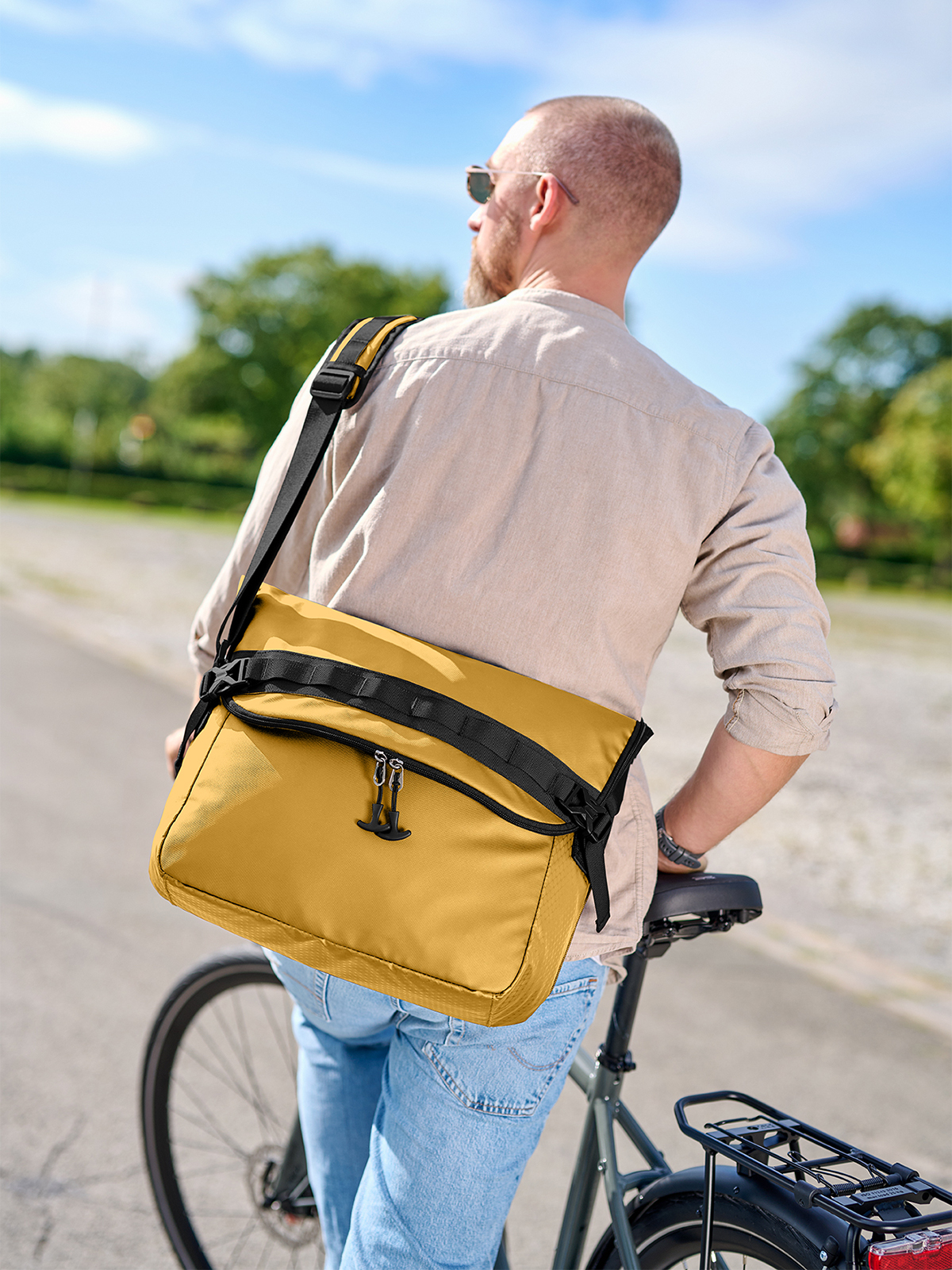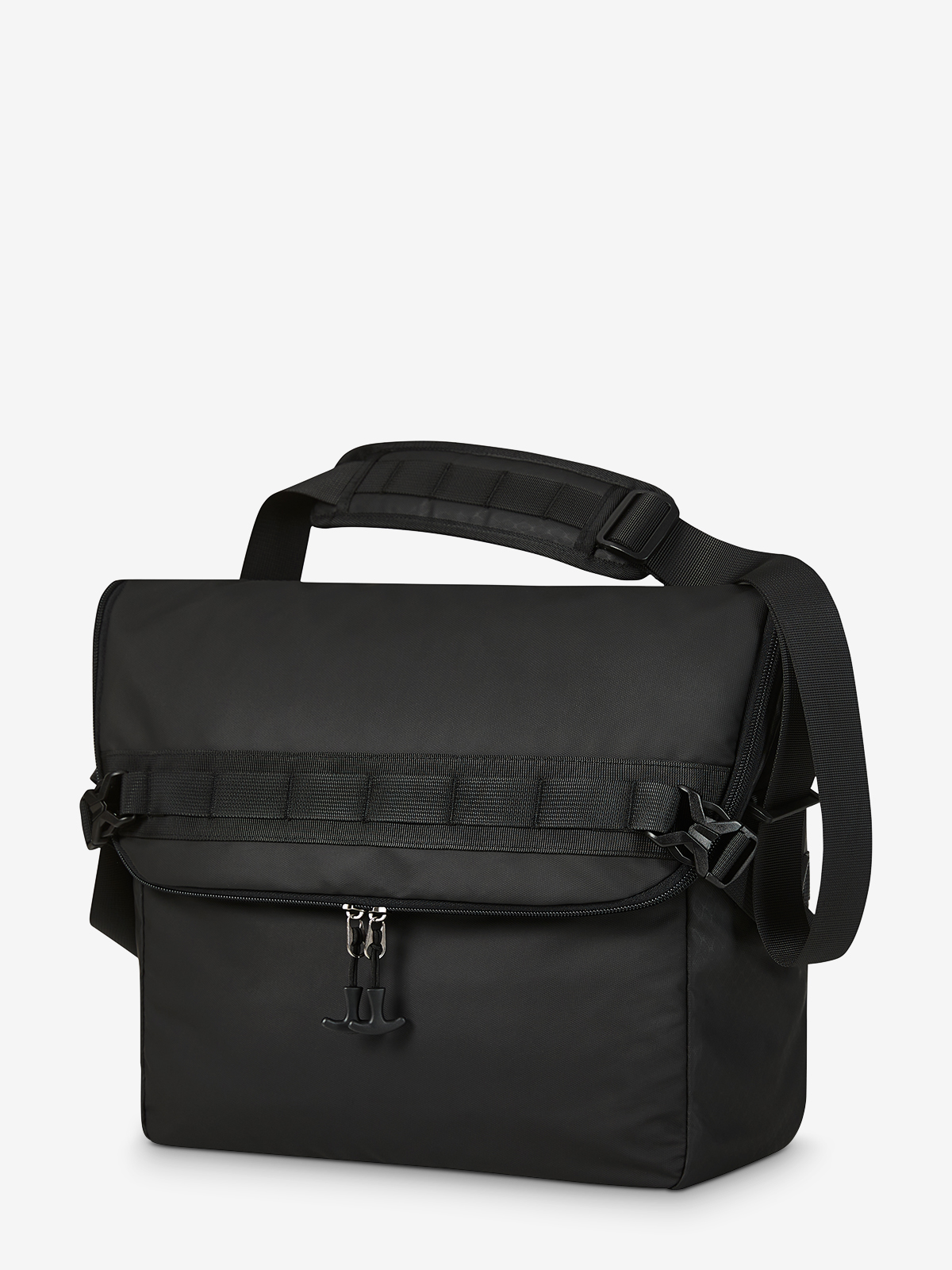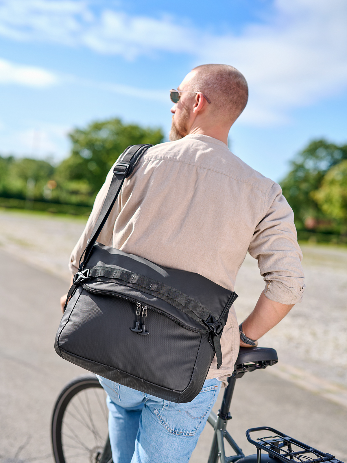 dynamic notebook bag; flap with 2-way zip, functional loop strap, side buckles; for use as volume expansion; large main compartment with quick access; padded notebook compartment with hook-and-loop tab; two slip-in pockets inside; zipped front pocket; handle and fastening loop for trolley handles; concealed zipped pocket on the back; padded back; padded base; length-adjustable shoulder strap on both sides with sewn shoulder pad; flexible waistband fixing - ideal for cycling