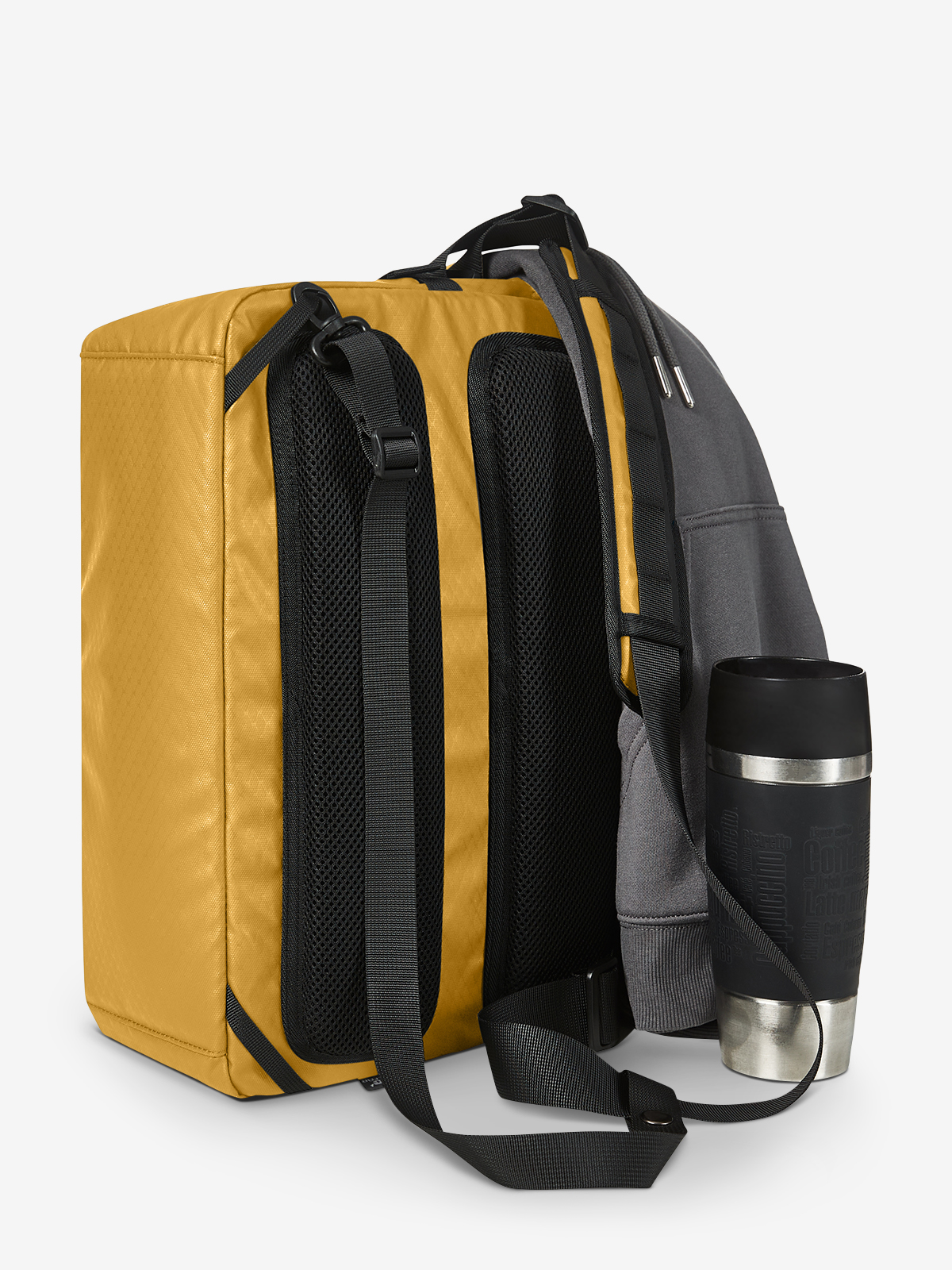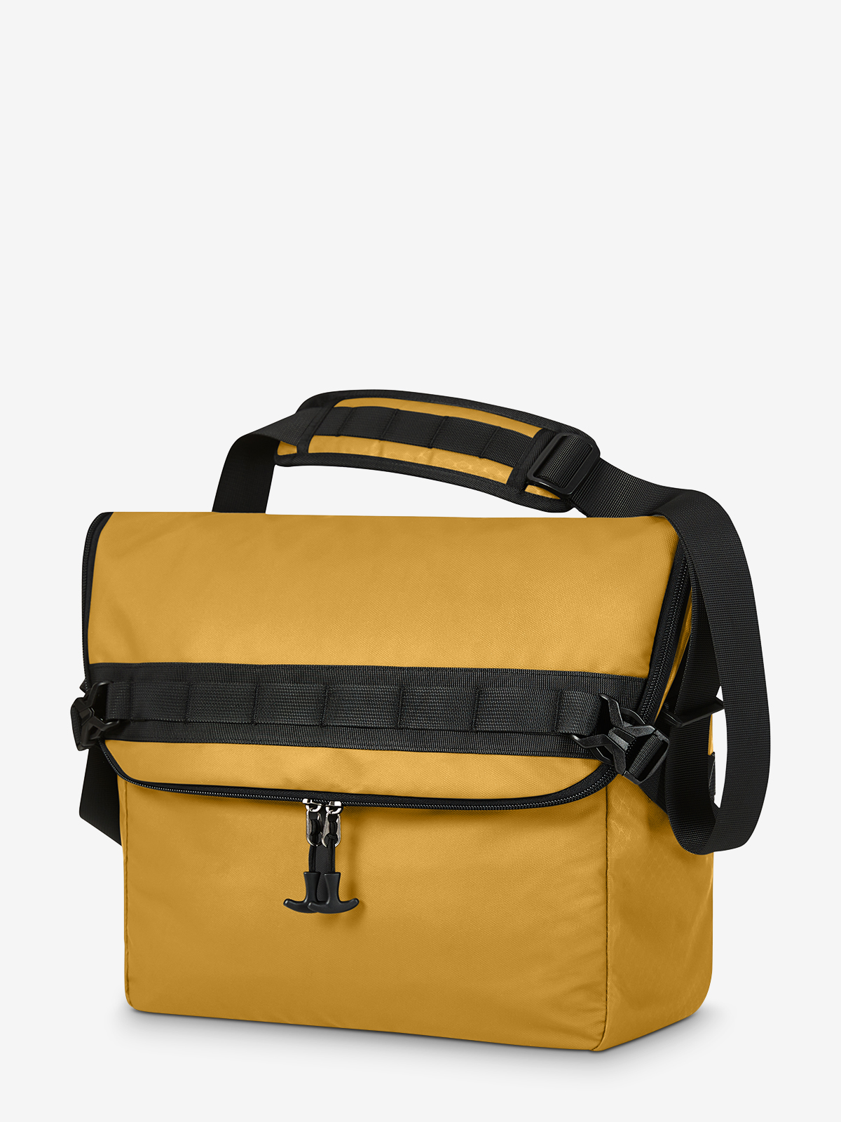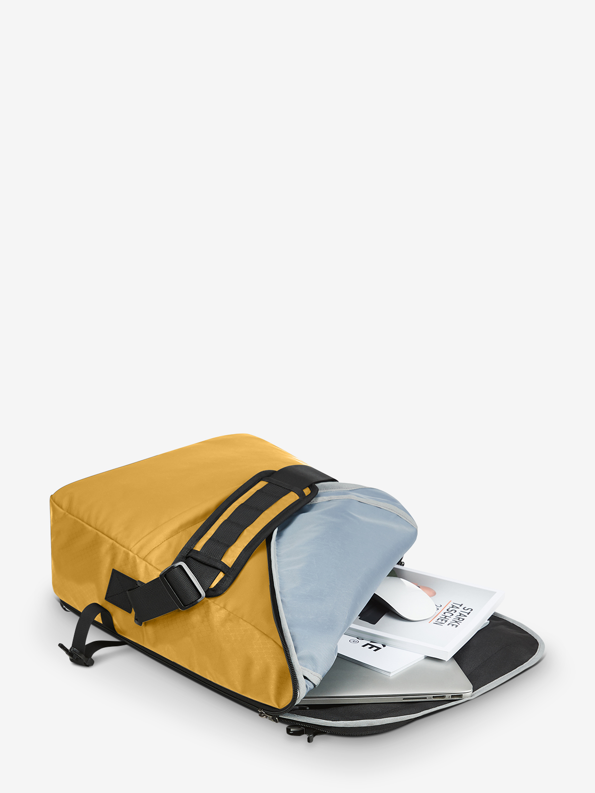 dynamic notebook bag; flap with 2-way zip, functional loop strap, side buckles; for use as volume expansion; large main compartment with quick access; padded notebook compartment with hook-and-loop tab; two slip-in pockets inside; zipped front pocket; handle and fastening loop for trolley handles; concealed zipped pocket on the back; padded back; padded base; length-adjustable shoulder strap on both sides with sewn shoulder pad; flexible waistband fixing - ideal for cycling