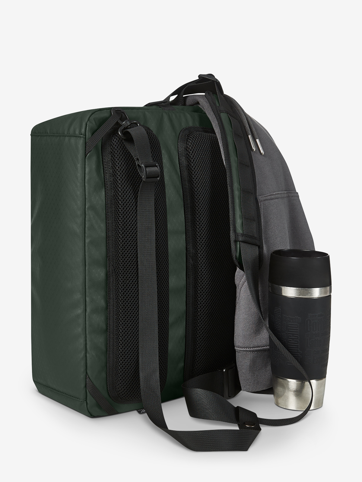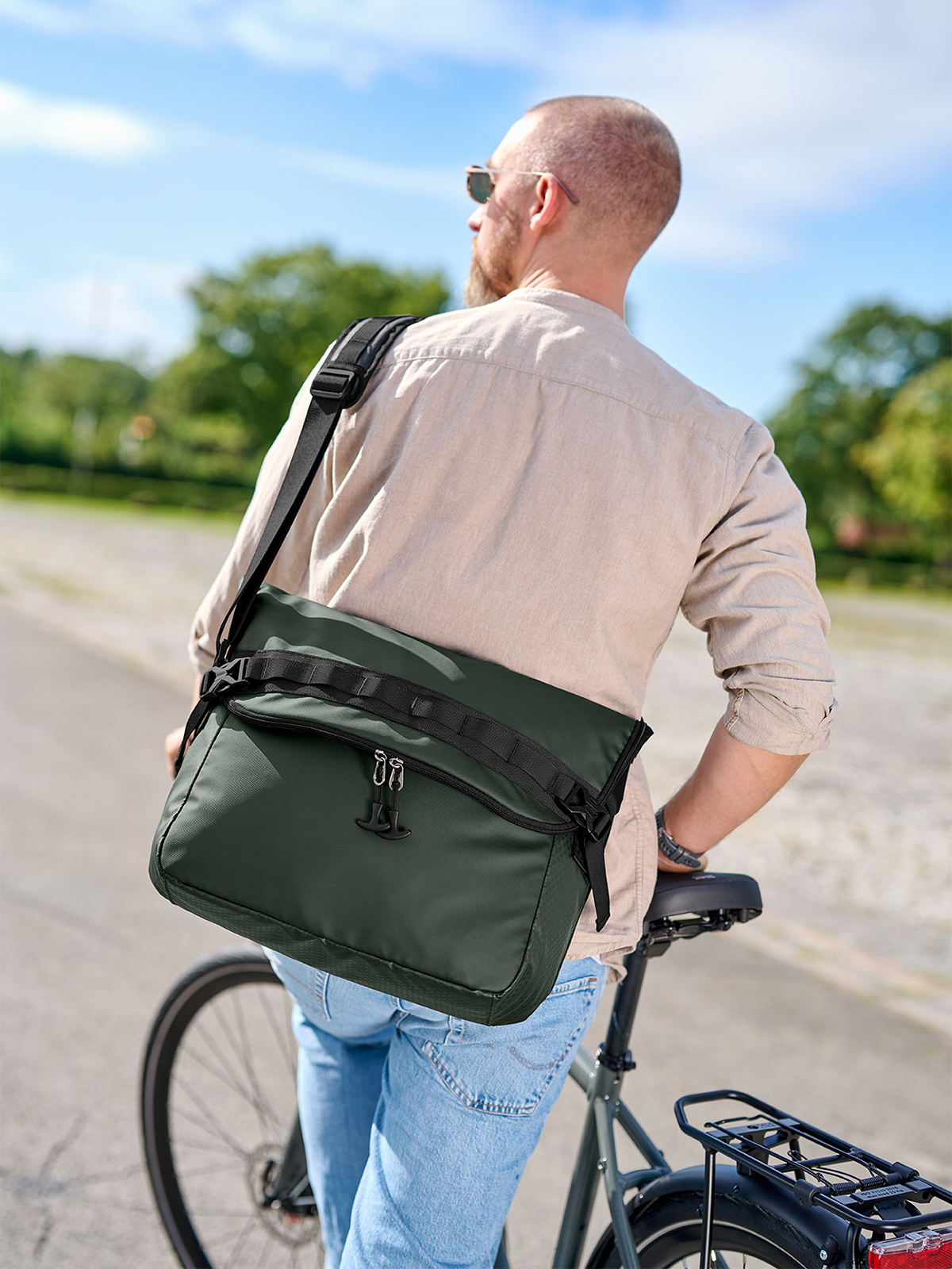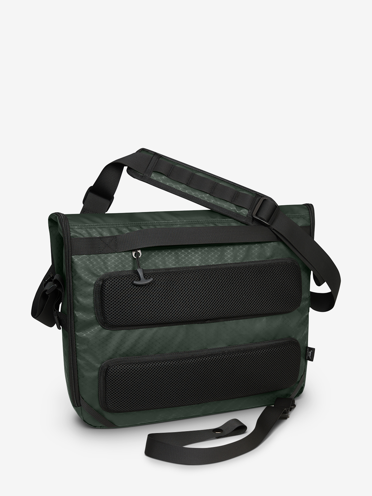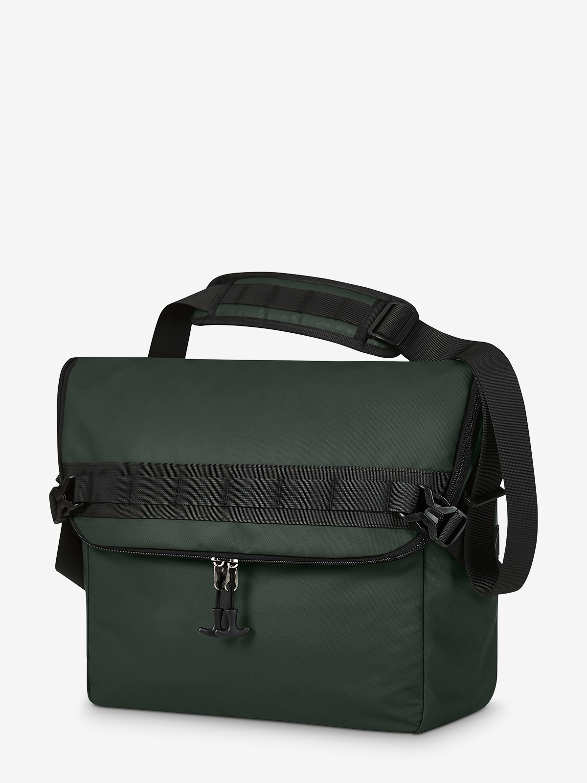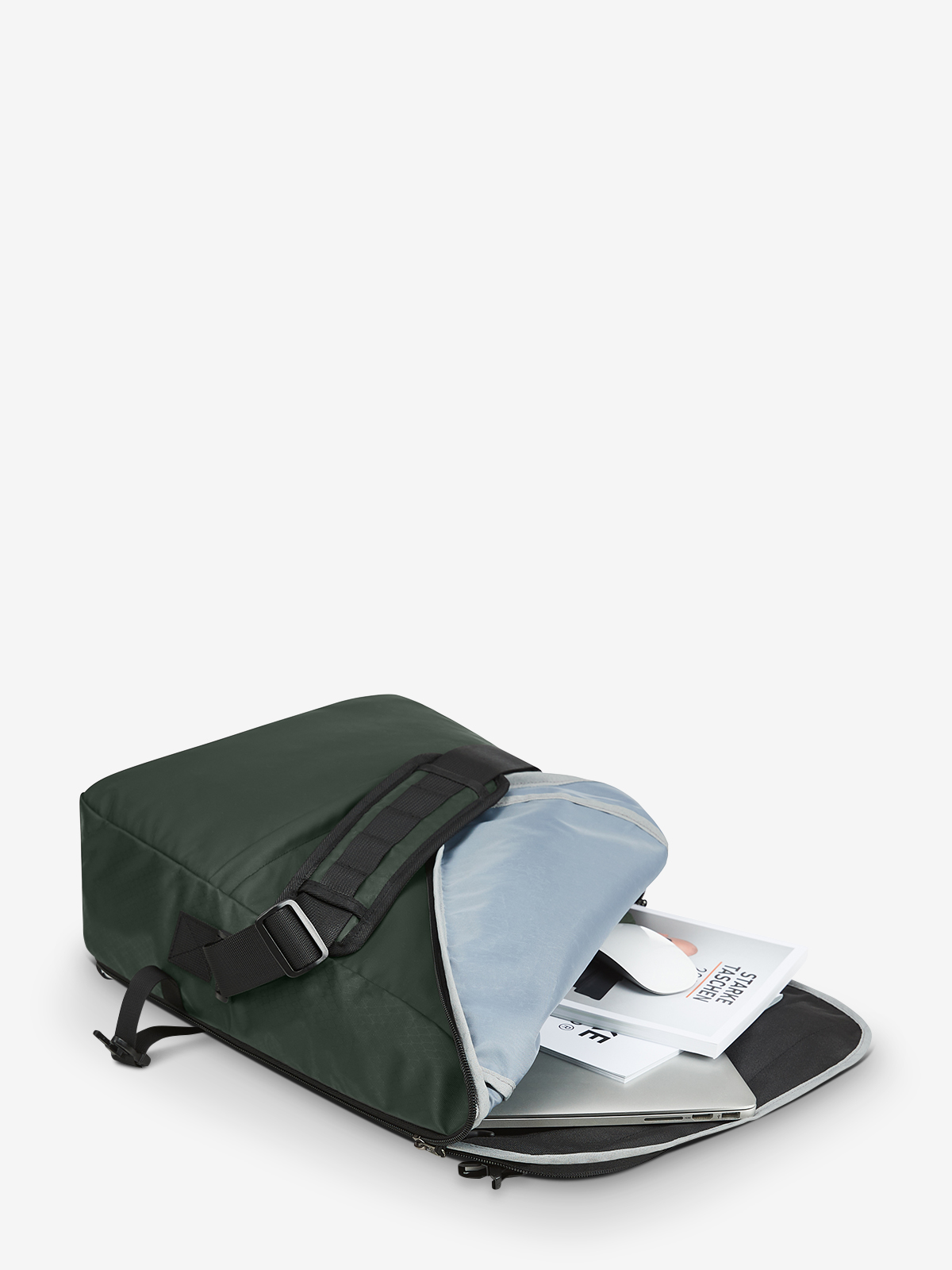 dynamic notebook bag; flap with 2-way zip, functional loop strap, side buckles; for use as volume expansion; large main compartment with quick access; padded notebook compartment with hook-and-loop tab; two slip-in pockets inside; zipped front pocket; handle and fastening loop for trolley handles; concealed zipped pocket on the back; padded back; padded base; length-adjustable shoulder strap on both sides with sewn shoulder pad; flexible waistband fixing - ideal for cycling