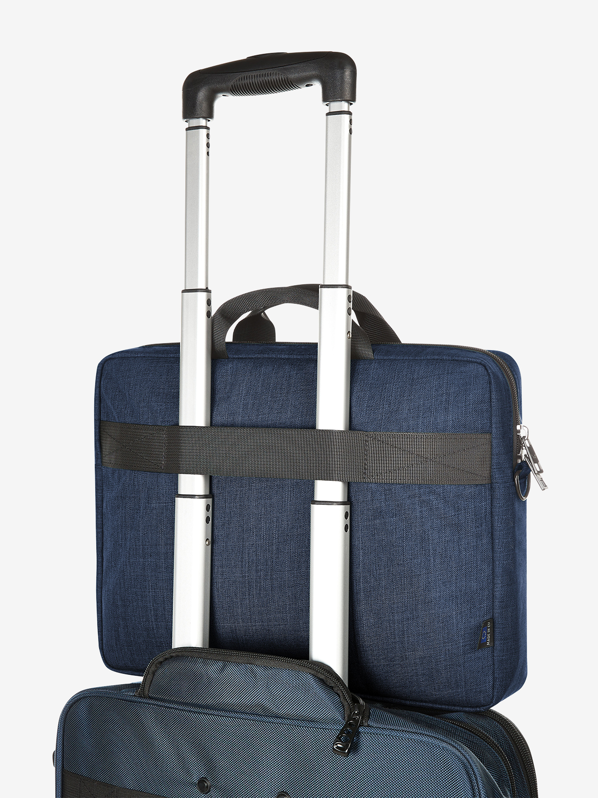 large, padded main compartment on the back with 2-way zip; rPET outer material; high-quality metal accessories; padded pocket e.g. for notebooks; flat front pocket with zip; rear fastening for trolley poles; detachable, length-adjustable shoulder strap; handles