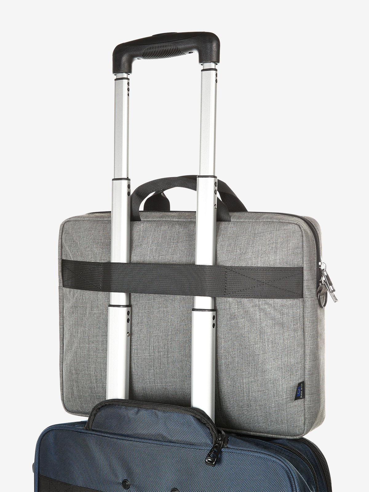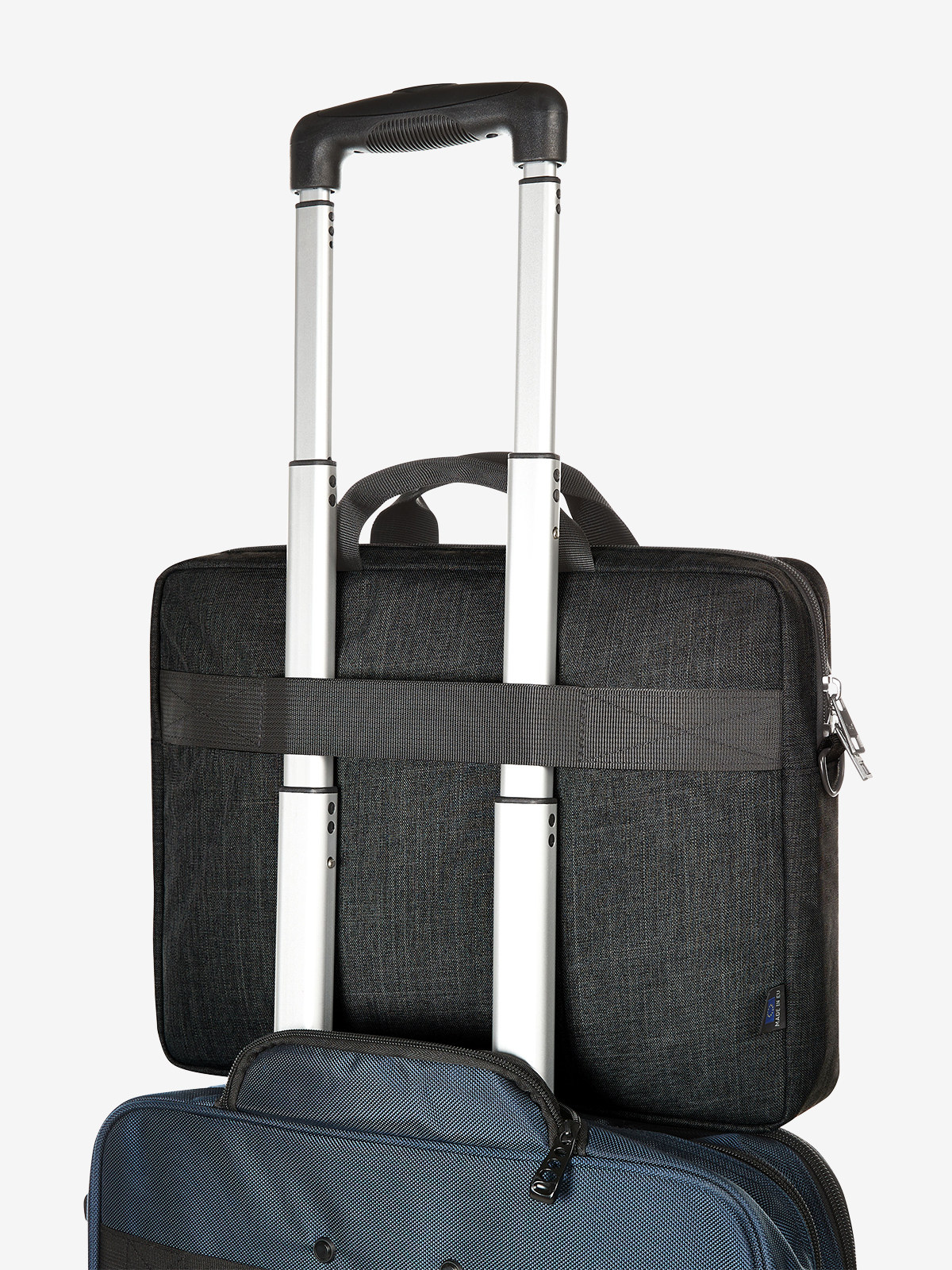 large, padded main compartment on the back with 2-way zip; rPET outer material; high-quality metal accessories; padded pocket e.g. for notebooks; flat front pocket with zip; rear fastening for trolley poles; detachable, length-adjustable shoulder strap; handles