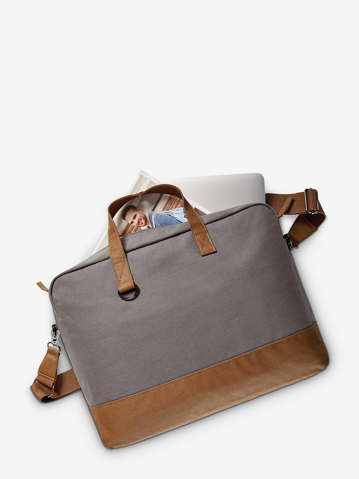 modern, elaborately crafted notebook bag; lovingly designed with high-quality metal accessories and coated cotton trims; large 2-way-zipper main compartment; padded notebook compartment with flat insert pockets and pen loops; zipper inner pocket; securer zipper rear insert pocket; handles with press stud; length-adjustable, detachable cotton shoulder strap