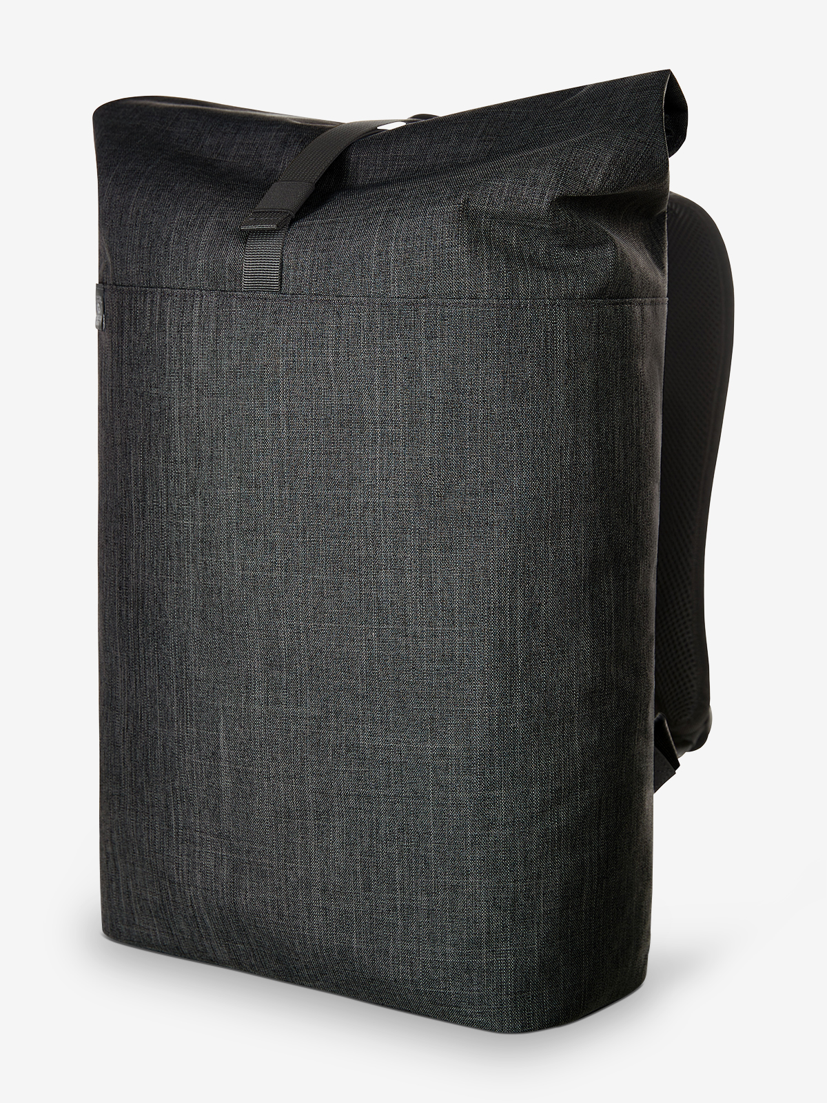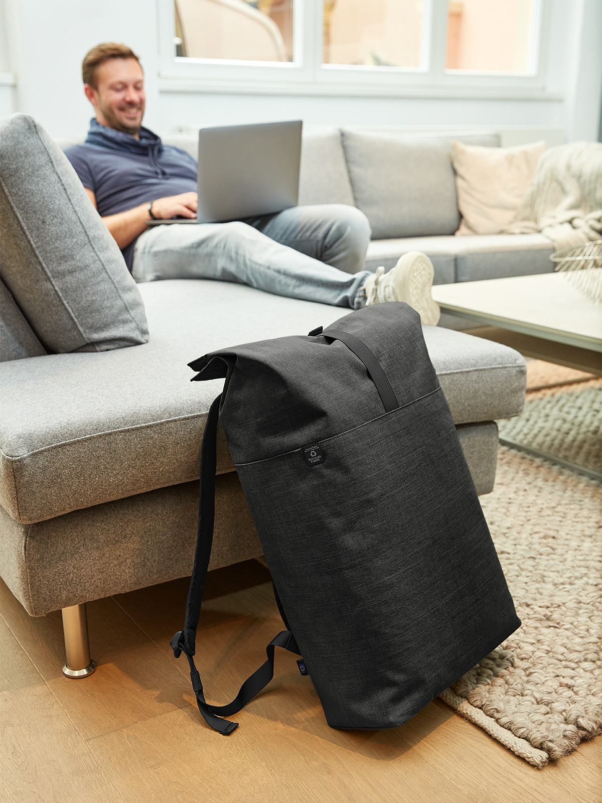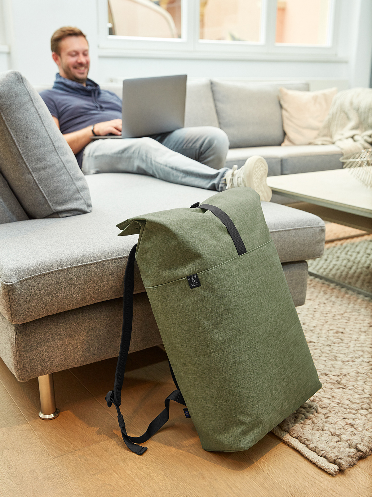 urban backpack with magnetic and roll closure; spacious main compartment with padded notebook compartment; rPET outer material; back pocket with zip; elaborately padded back with hidden zip compartment; padded base; length-adjustable padded shoulder straps with rubber loops to attach items such as sunglasses; handle