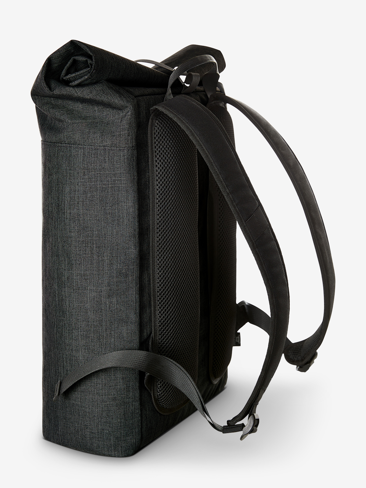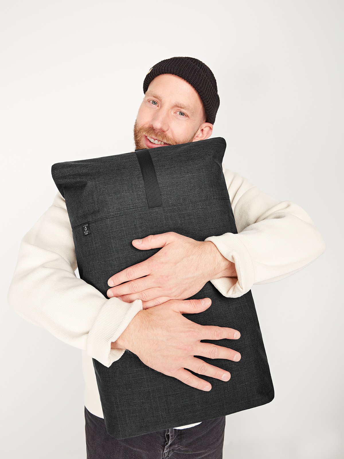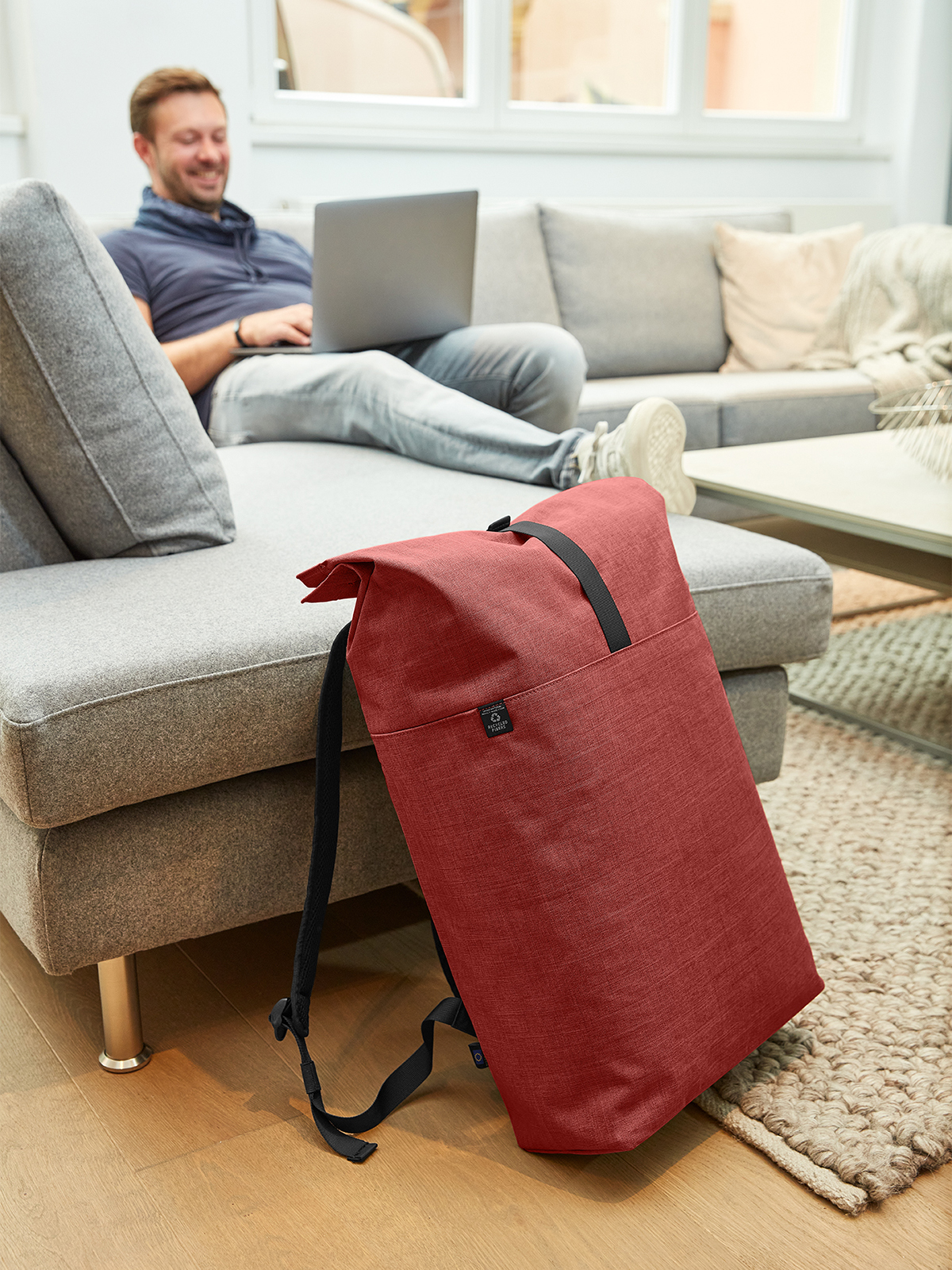 urban backpack with magnetic and roll closure; spacious main compartment with padded notebook compartment; rPET outer material; back pocket with zip; elaborately padded back with hidden zip compartment; padded base; length-adjustable padded shoulder straps with rubber loops to attach items such as sunglasses; handle