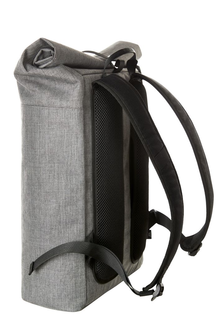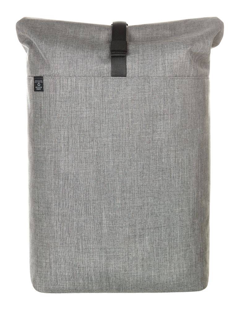 urban backpack with magnetic and roll closure; spacious main compartment with padded notebook compartment; rPET outer material; back pocket with zip; elaborately padded back with hidden zip compartment; padded base; length-adjustable padded shoulder straps with rubber loops to attach items such as sunglasses; handle