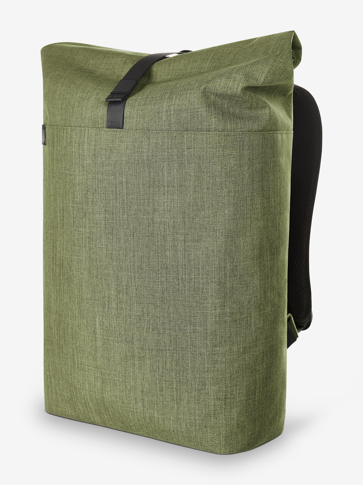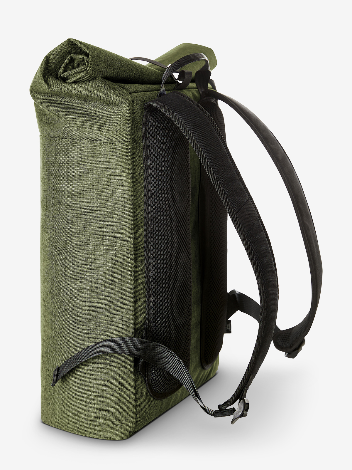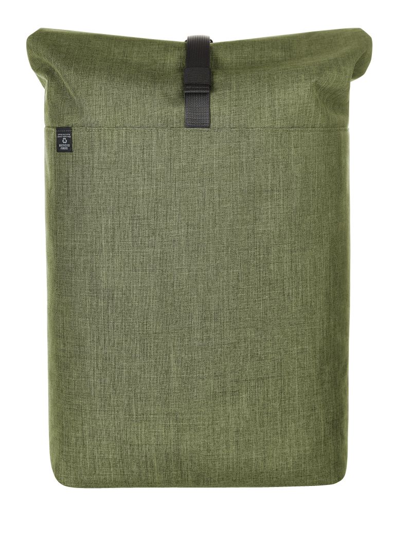 urban backpack with magnetic and roll closure; spacious main compartment with padded notebook compartment; rPET outer material; back pocket with zip; elaborately padded back with hidden zip compartment; padded base; length-adjustable padded shoulder straps with rubber loops to attach items such as sunglasses; handle