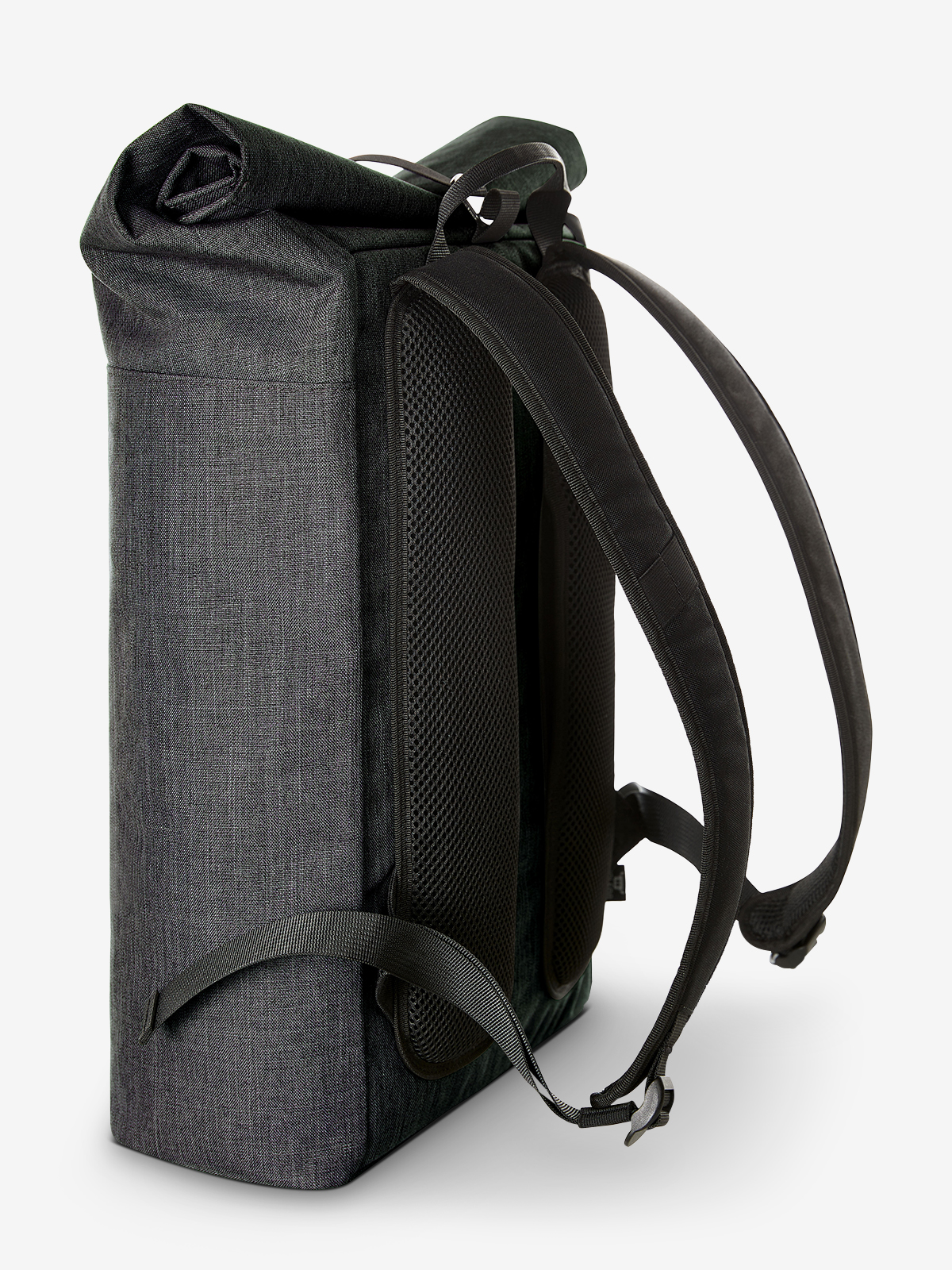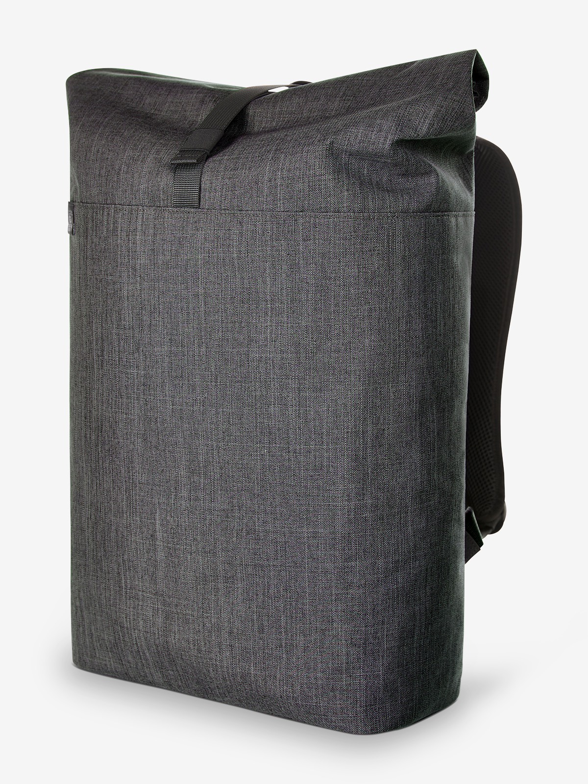 urban backpack with magnetic and roll closure; spacious main compartment with padded notebook compartment; rPET outer material; back pocket with zip; elaborately padded back with hidden zip compartment; padded base; length-adjustable padded shoulder straps with rubber loops to attach items such as sunglasses; handle