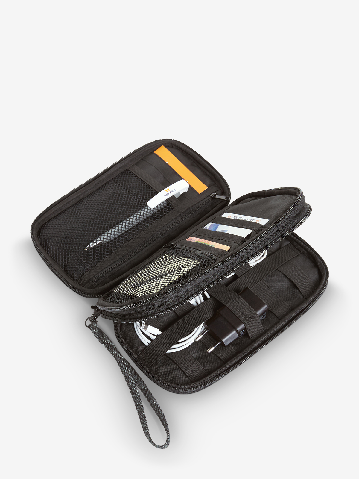 Credit cards, EC cards, customer cards, driving licence, business cards, tickets, boarding pass… you might still get some of these plastic cards and documents into your wallet. But it soon reaches its limits when you get to just as important travel utensils such as pens, memo, charging cable, USP stick or earphones. This is where our FRAME organizer comes in. All that and more can be carefully inserted into two zipper compartments, or pushed in, cleverly deposited in net pockets or pinned under elastic bands. A neat performance!