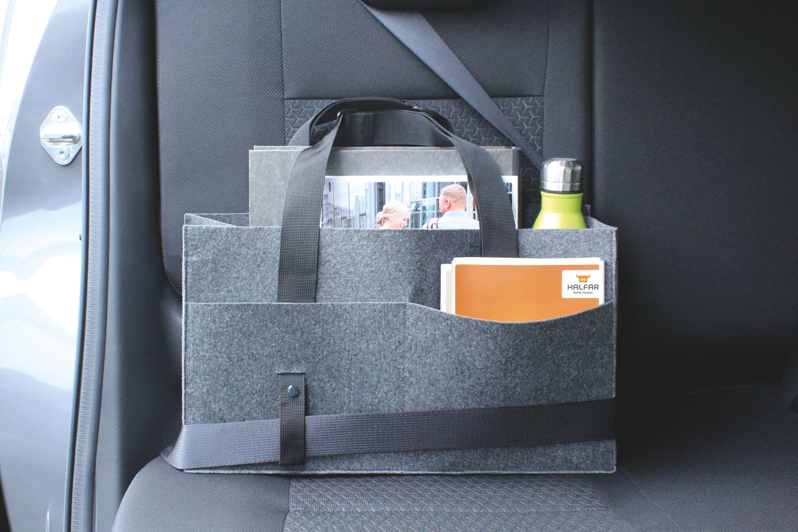 Free yourself from the lifelong place at your desk in the corner and decades of the usual spot in Monday meetings: office work is now much more flexible and inspiring with ‘New Work’. Despite changing teams and jobs, your own things can always come with you! An organiser such as the Modern Classic help in such small everyday relocations. Project documents, laptop, telephone, keypad, thermos flask, coffee cup, cactus for the desk and family photo fit into the pockets in an orderly fashion. Thanks to the transparent pocket for the business card, it identifies the owner personally – as even the modern office person needs something personal. By the way: sales reps also travel well with this organiser. Thanks to an extra function, it can be belted onto the passenger seat.