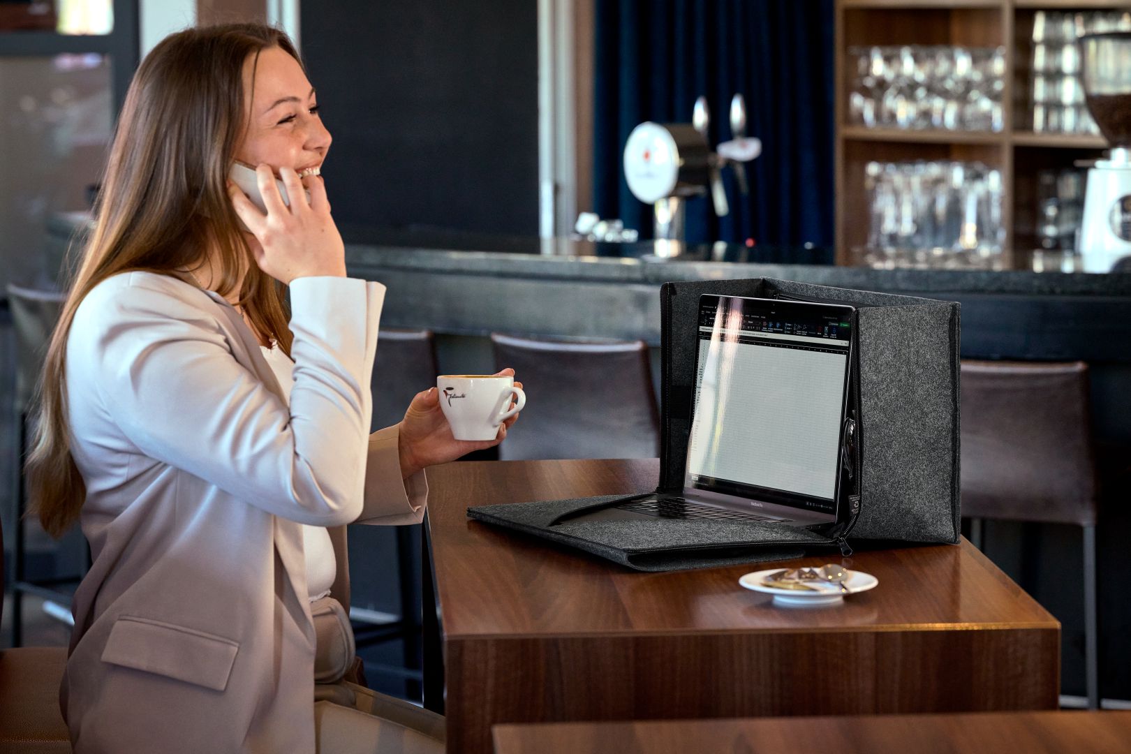 You really can't tell what this beautiful felt bag cando. Because it contains a highly professional organizer that offers a deskspace with privacy protection. How so? It's simple: A side panel including thelid can be opened super quickly and easily with zippers. This turns out to bean ideal place for your laptop, well protected from all sides – even fromprying eyes. This means that you have an excellently organized workplace on thetrain, in the café and wherever you want to work on the road. In addition toyour laptop, A4 documents and all kinds of material also fit into the maincompartment and the slip pockets inside and outside. The wide,length-adjustable straps are stylish and extremely comfortable to carry. By theway, the organizer is also sustainable: thanks to recycled PES felt.