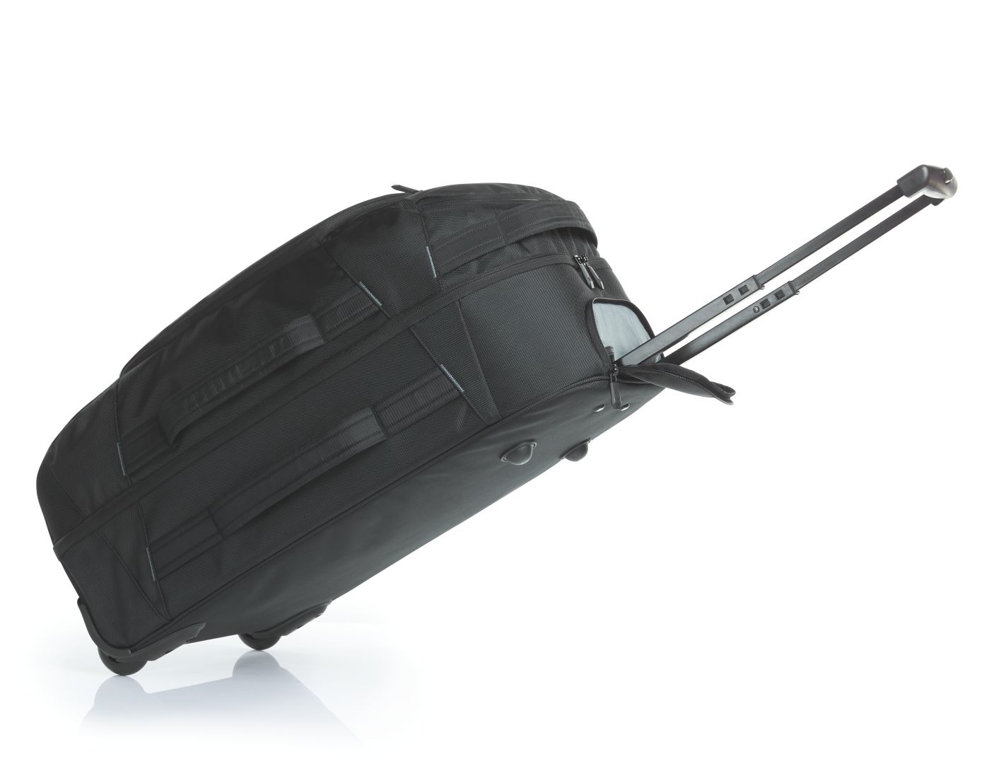 elaborate trolley case with reflex trim; main compartment with two-way zip on three sides; main compartment top with zipped separator; main compartment bottom with elastic packing straps; small zipped front pockets with coloured zip slider; large front pocket with two-way zip, flat, padded pouch, two small pouches, large mesh zipped pocket and elastic loops; padded handles; reinforced base; base feet; telescopic handle; easy-roll wheels;  padded handle Zipper slide available in the colours shown.