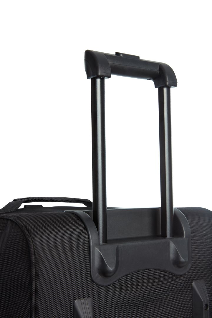 spacious zipper main compartment; zipper front pocket with decorative backstitching; telescopic pole; lightweight rollers; handles with padded grips; removable, length-adjustable shoulder strap with shoulder pad