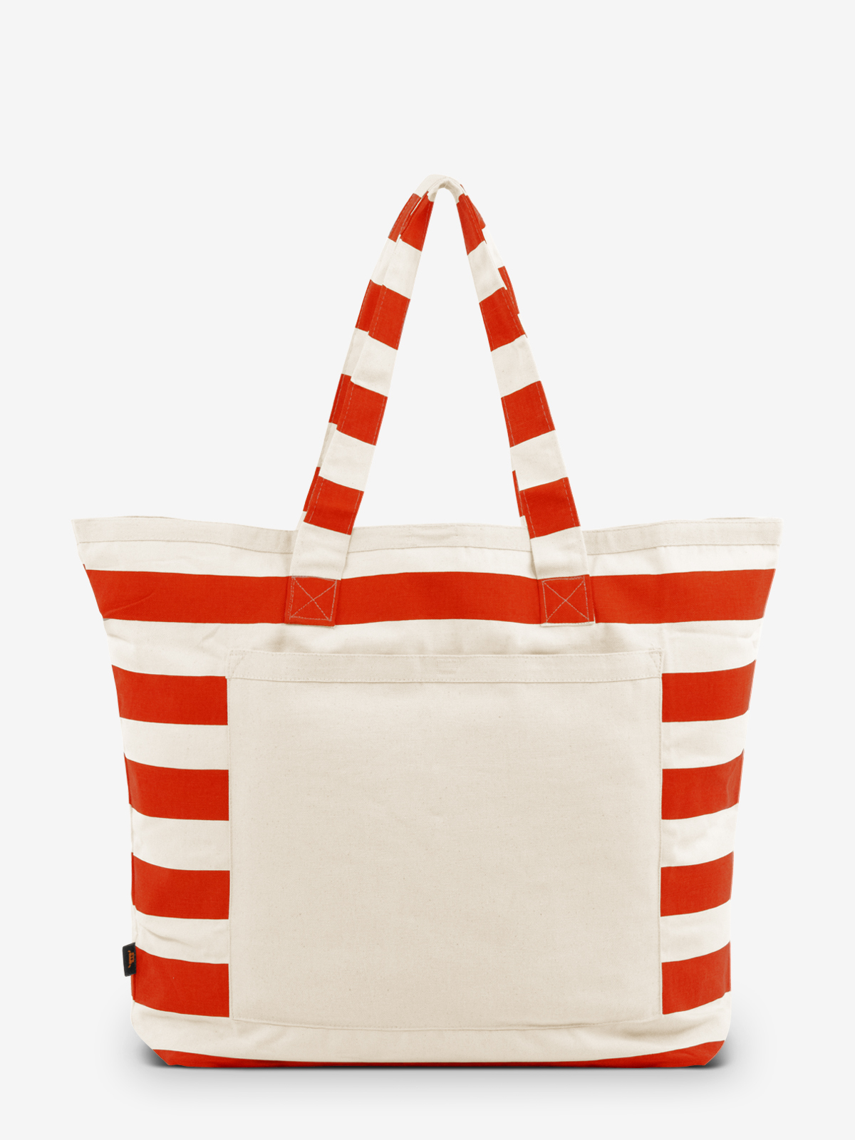 very large cotton shopper, heavy quality; generous cut with large front pocket; hook and loop tape closure; contemporary block stripe design