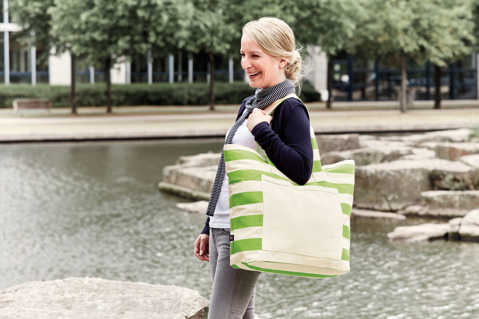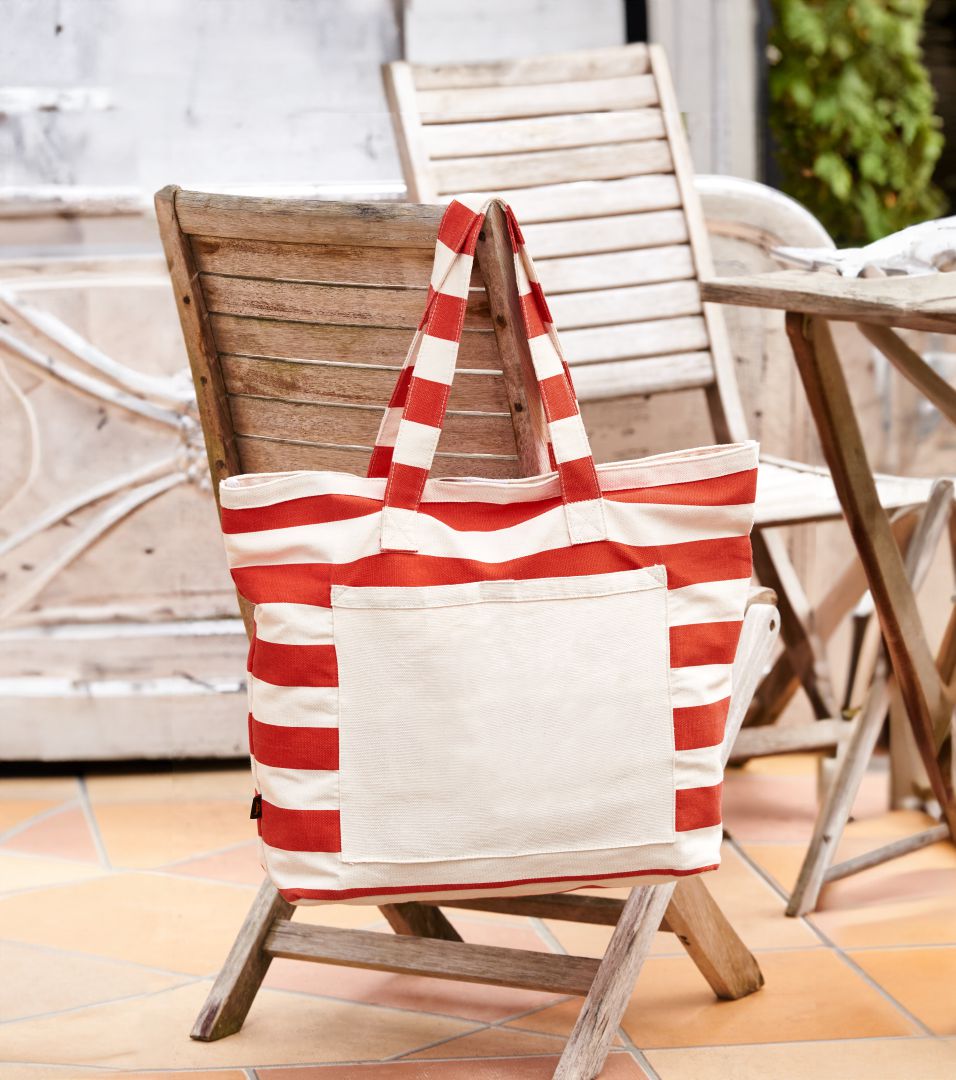 A beautiful bag can never be too big. So we have created the striped shopper BEACH made of robust cotton in a truly veritable size. Everything you need for a day at the beach fits inside - small towel, big towel, sun cream, book, frisbee, water bottle and biscuits...you just need to stick the parasol under your arm. The cotton quality with its robust feel will certainly make the next stroll around town a pleasure. The Velcro fastener makes sure that all the bag contents stay together. And the coloured block stripes guarantee that you will maintain your good mood.