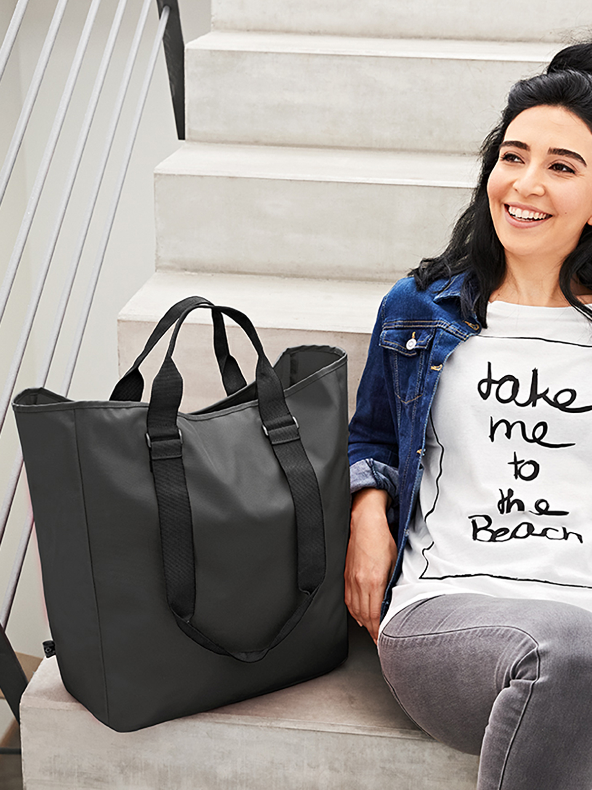 Beautifully designed, large shopper; RPET upper material; main compartment with hanging zipped organiser; carrying system with double handles and decorative buckle