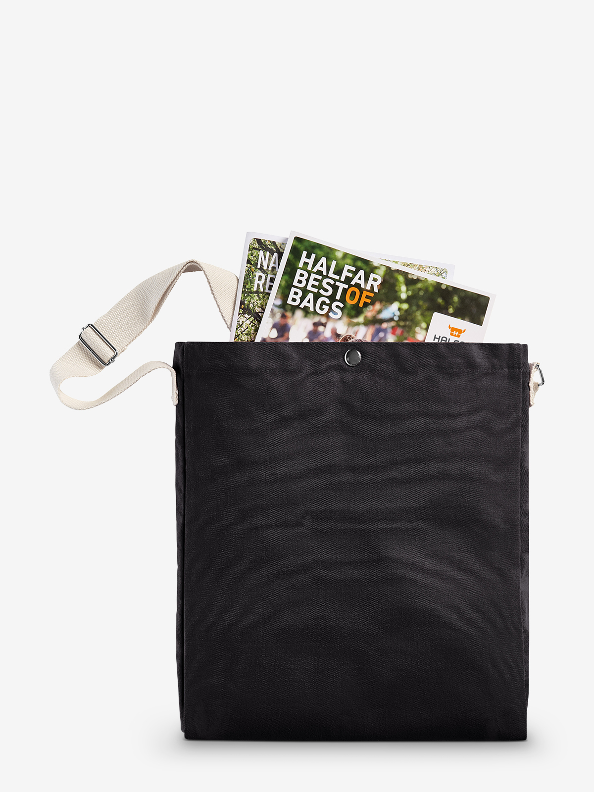 streamlined shopper with large print area; spacious main compartment - ideal for catalogues and A4 documents, closed by press stud; wide, adjustable cotton shoulder strap