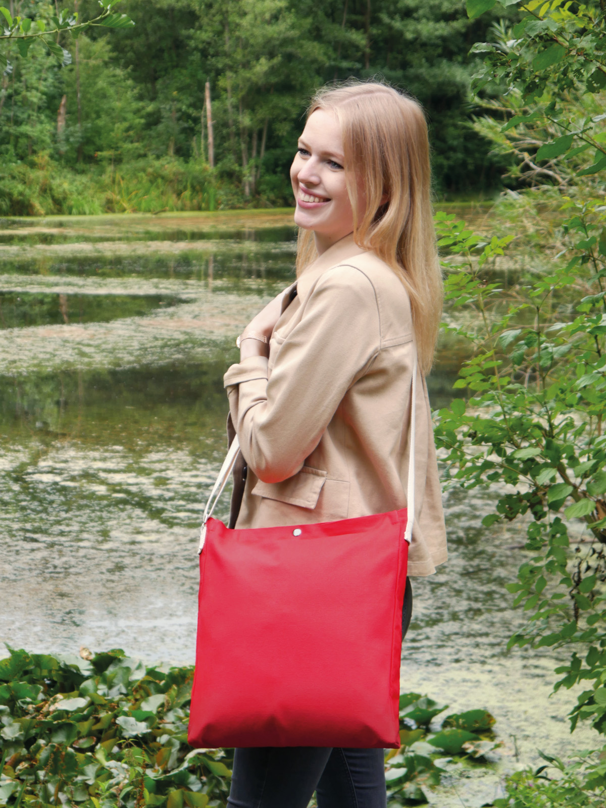 streamlined shopper with large print area; spacious main compartment - ideal for catalogues and A4 documents, closed by press stud; wide, adjustable cotton shoulder strap
