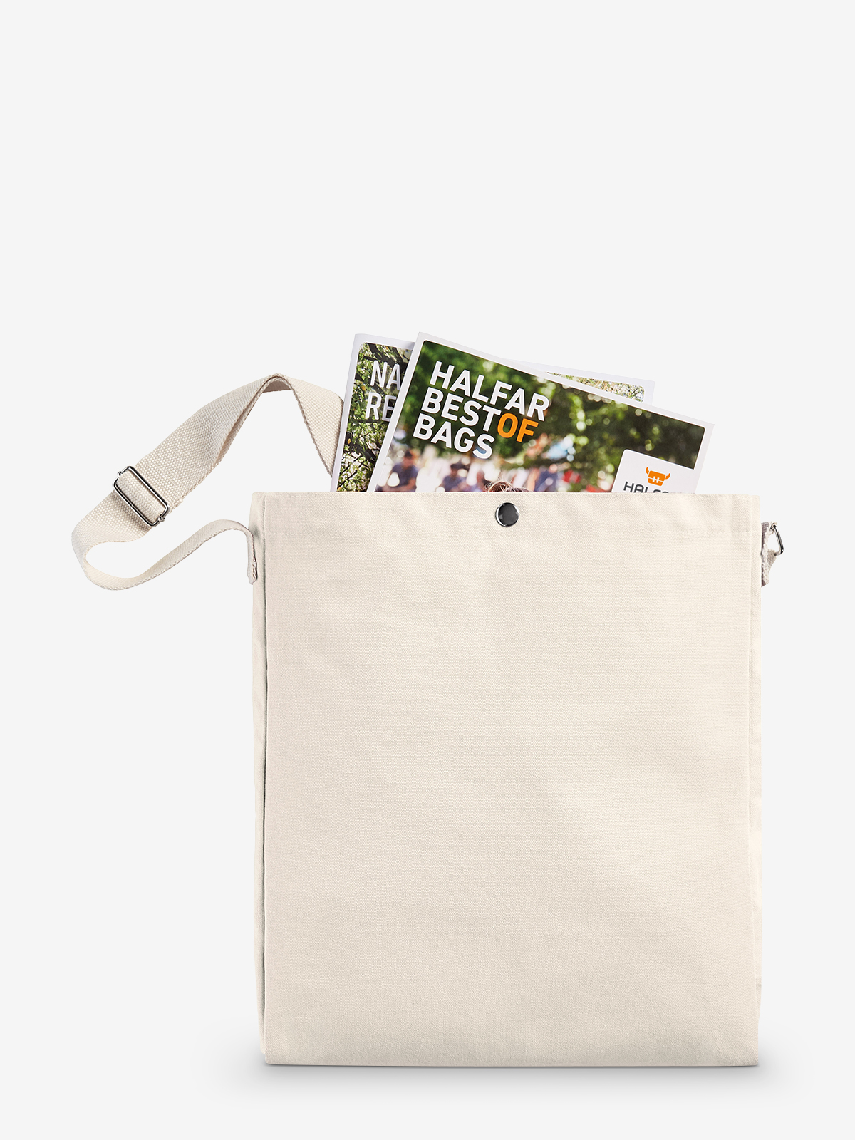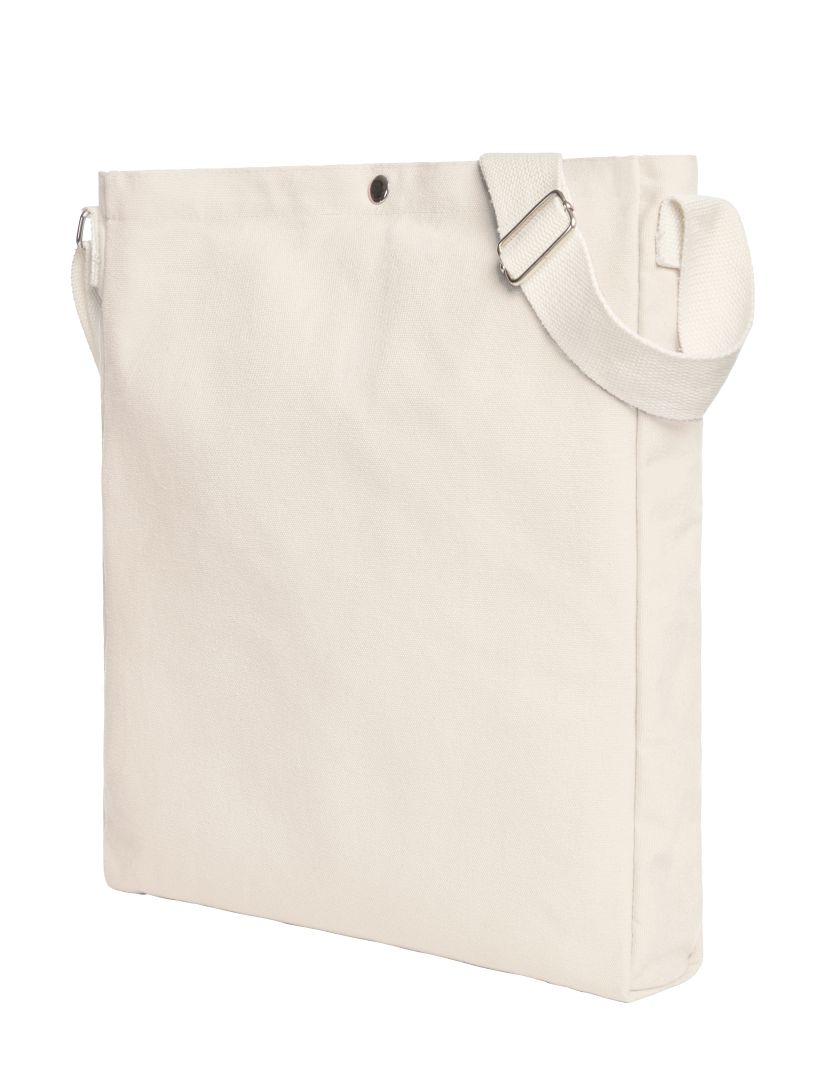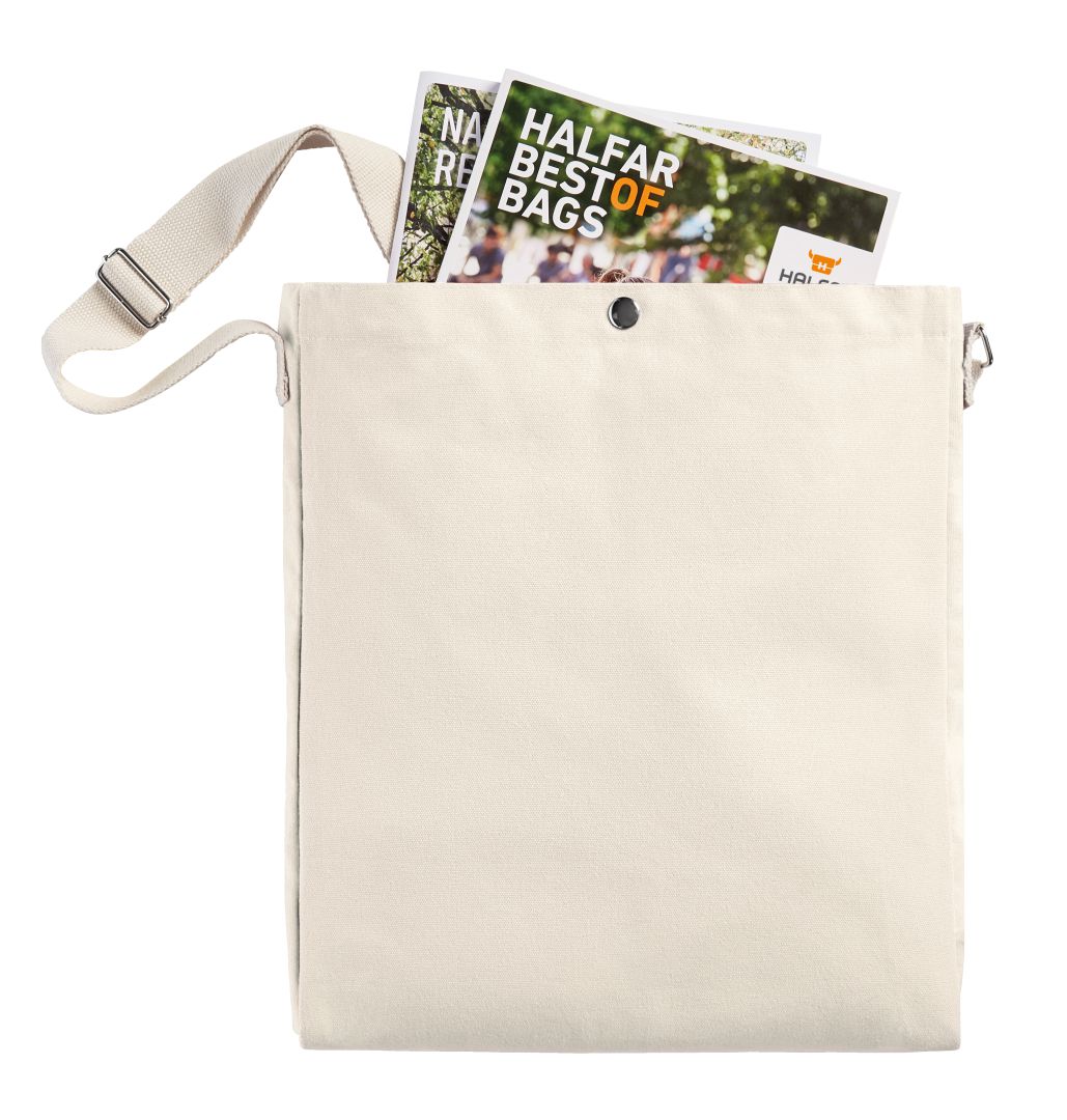 streamlined shopper with large print area; spacious main compartment - ideal for catalogues and A4 documents, closed by press stud; wide, adjustable cotton shoulder strap