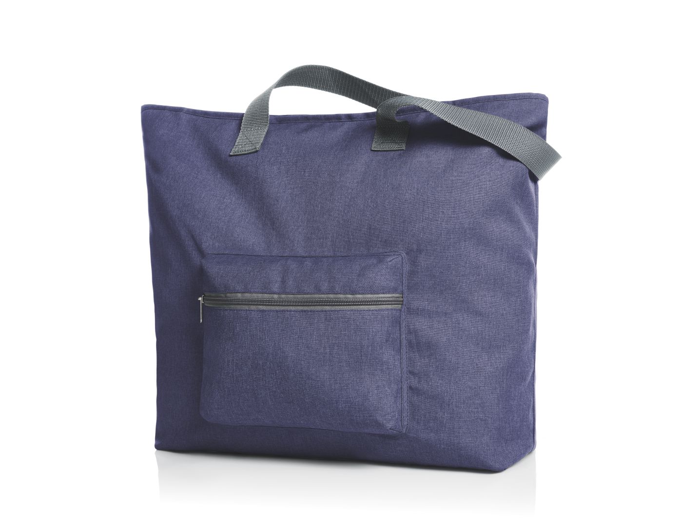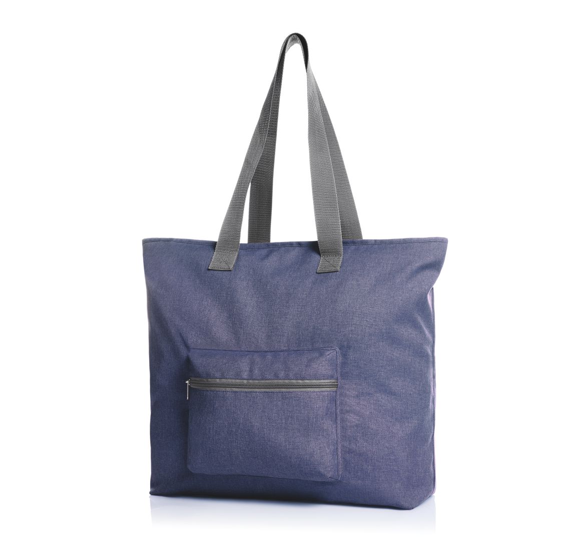 large shopper; spacious main compartment with zipper; front zipper pocket; inside zipper pocket; long carrying handles; folding and stowing function