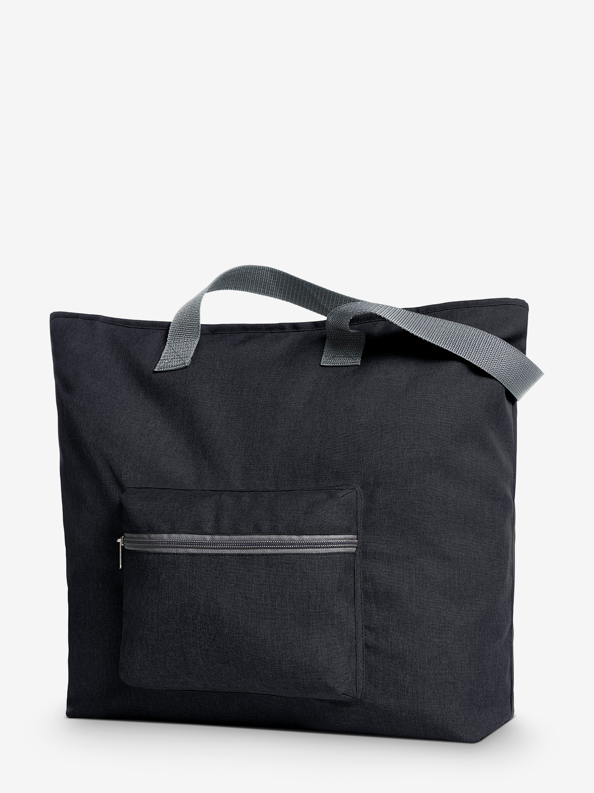 large shopper; spacious main compartment with zipper; front zipper pocket; inside zipper pocket; long carrying handles; folding and stowing function
