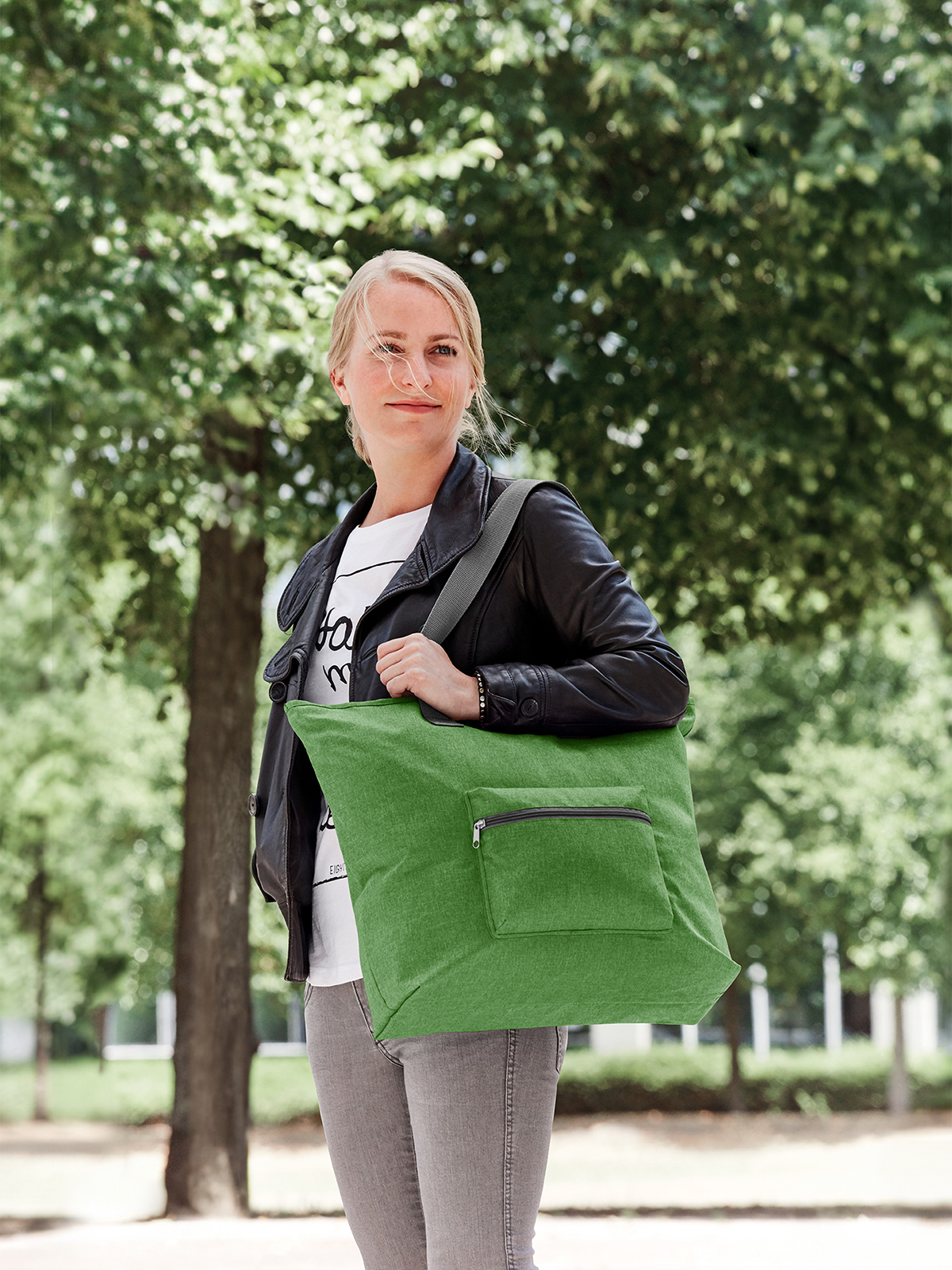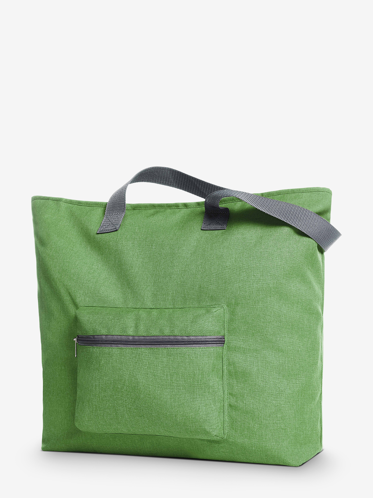 large shopper; spacious main compartment with zipper; front zipper pocket; inside zipper pocket; long carrying handles; folding and stowing function