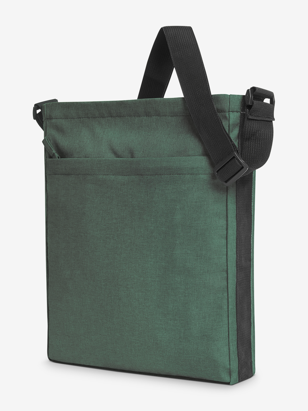 It’s true: this bag was once a bottle. Strictly speaking about 24 bottles, as its upper material is made from the fibres of recycled PET bottles. However, you do not notice that the smart CIRCLE shoulder bag is enjoying its reincarnation – apart from our own especially sewn-in recycling label of course. On the contrary: it looks decidedly fresh in its linear shape. A black strap running around the sides creates additional accentuation. Thanks to its format and its lightness, this bag is very well suited for print materials – making it a modern bag for exhibitions.