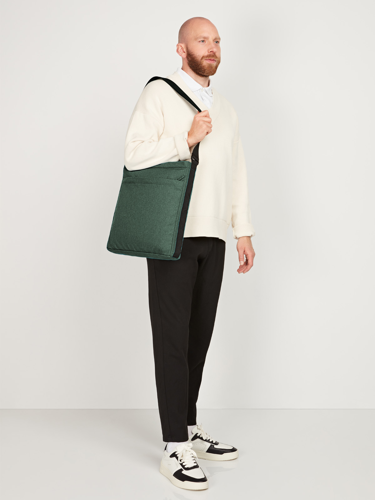modern shoulder bag; rPET upper material; spacious zipped main compartment; outer pocket with hidden zip; adjustable strap