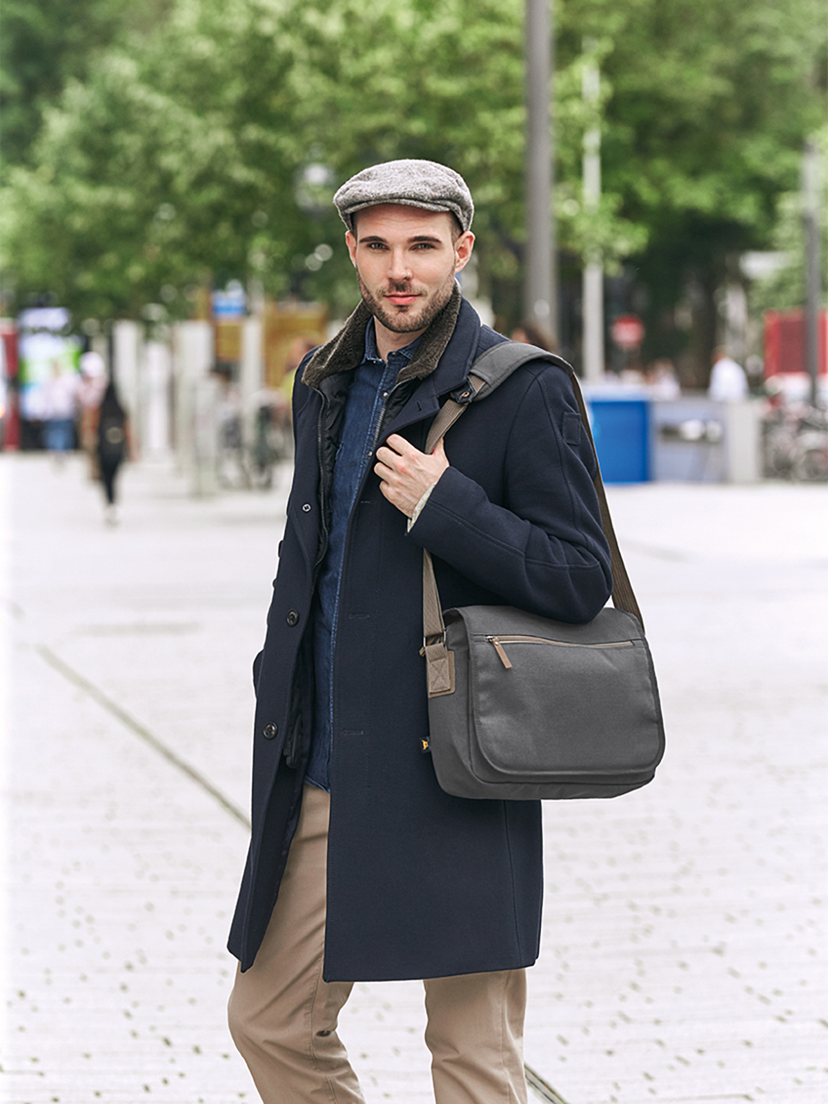 large, back-padded, zipped main compartment with padded pouch e.g. for tablet; flat zipped inside pocket; flat pocket on front; flap with magnet fastening and zipped front pocket; adjustable shoulder strap with sewn shoulder pad; high-quality metal accessories and PU velour artificial leather applications