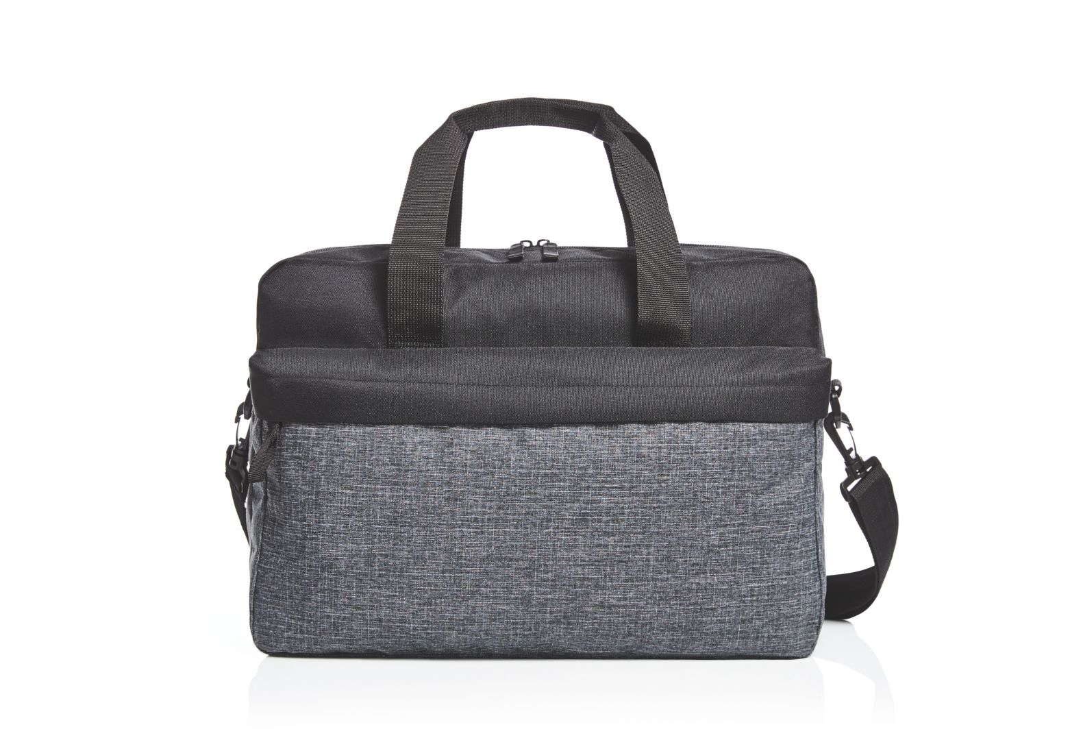 spacious, bicoloured shoulder bag; large main compartment sufficiently large for 2 large A4 document files; 2-way zipper running circumferentially around sides for easy filling; padded front and rear side; fixed liner base; inner zipper pocket; zipper front pocket with organizer elements; rear-side flat compartment, fastening loop for trolley handles; removable, length-adjustable shoulder strap with shoulder pad; handles