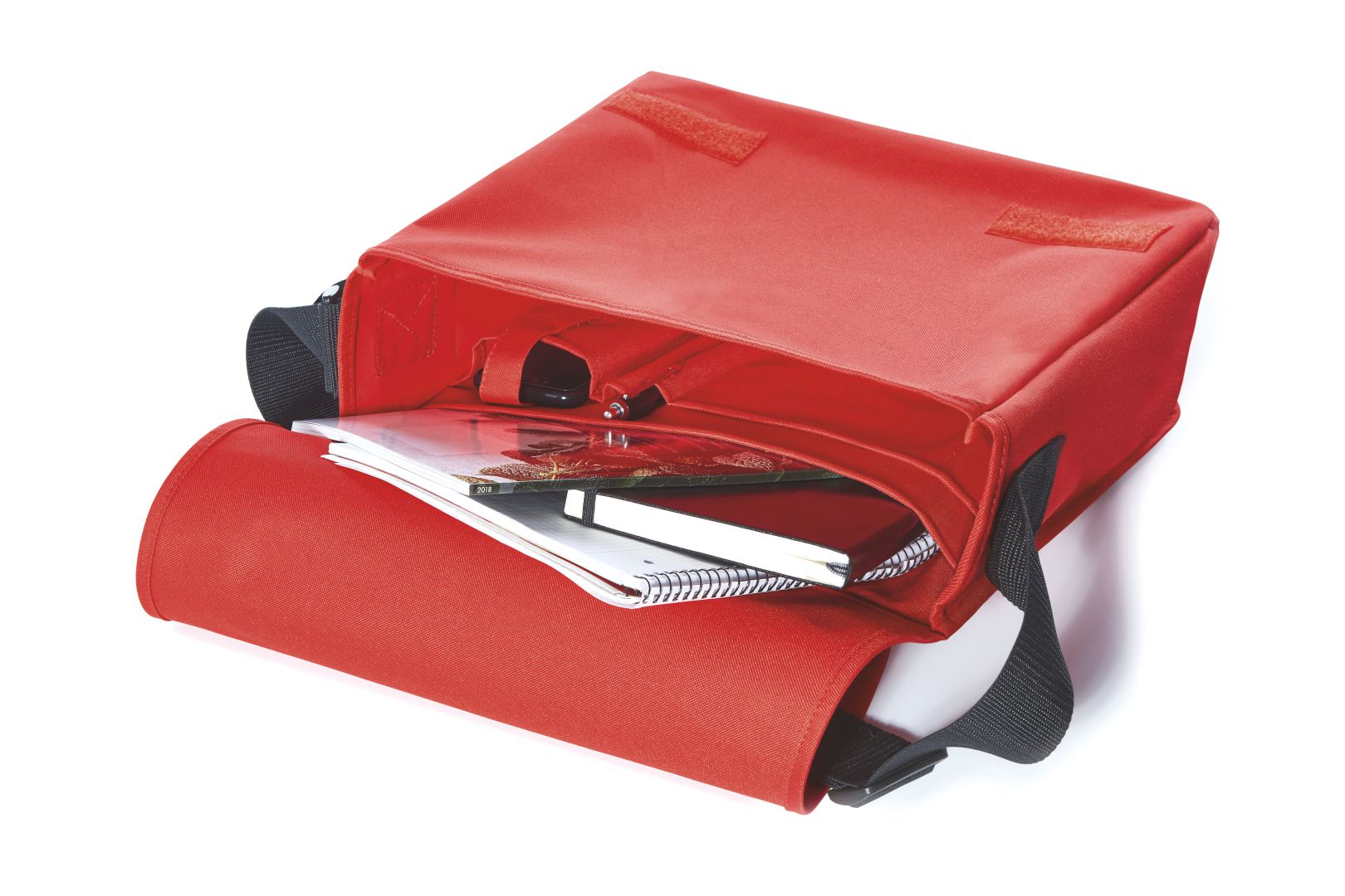 spacious main compartment with organizer elements; flat inside compartment; padded back; length-adjustable shoulder strap; large flap with hook and loop tape fastener