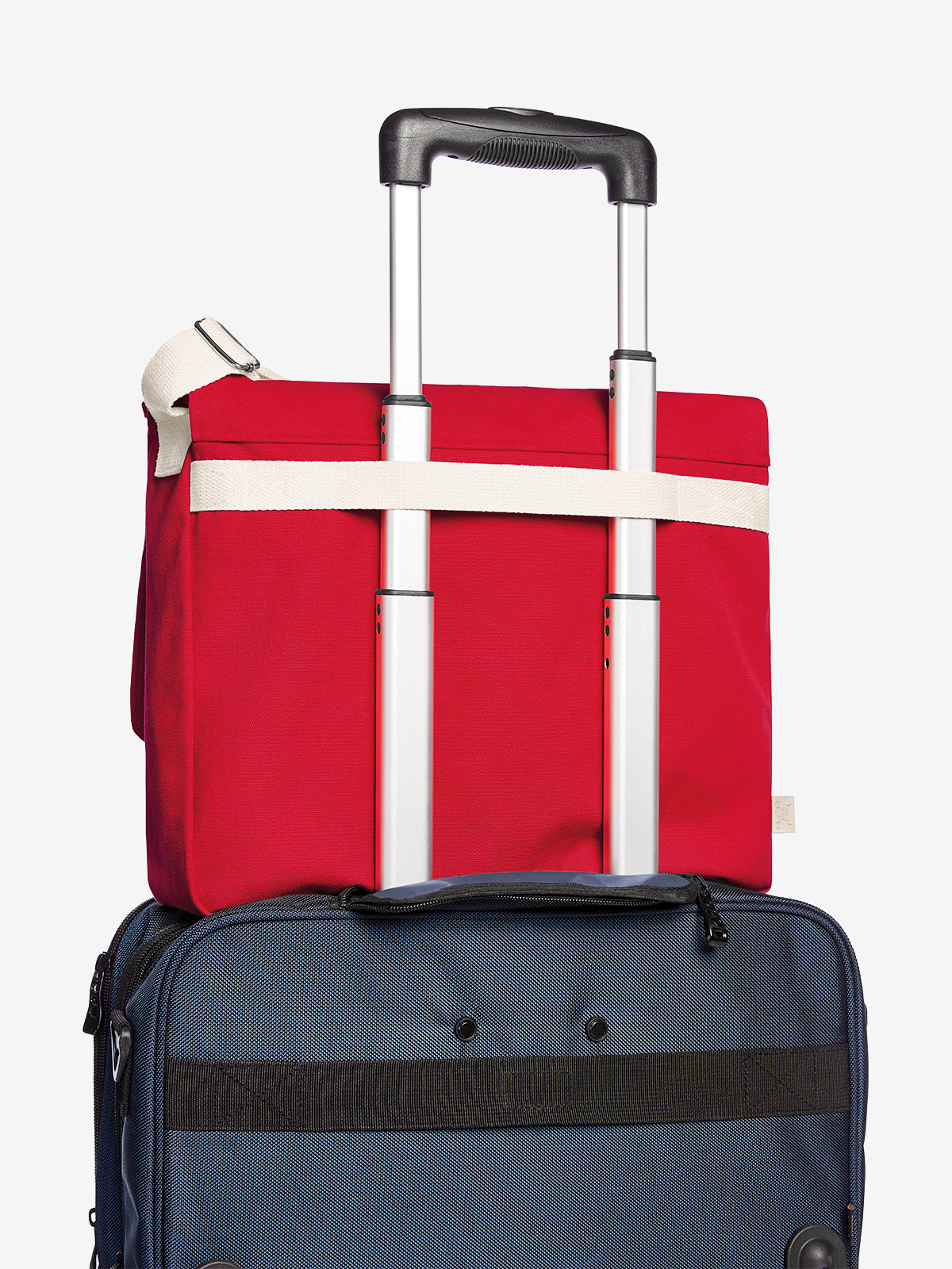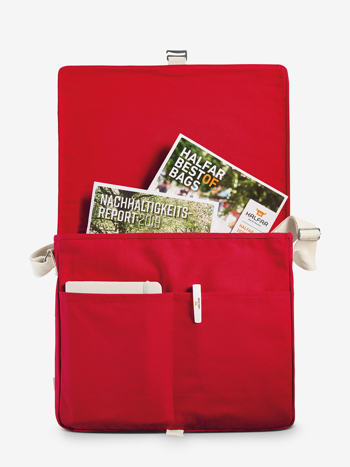 flap pocket with high-quality metal accessories; clip clasp; large main compartment suitable for A4 documents; two flat insert pockets on the front; rear attachment loop for trolley handles - can also be used as a handle; wide, adjustable cotton shoulder strap
