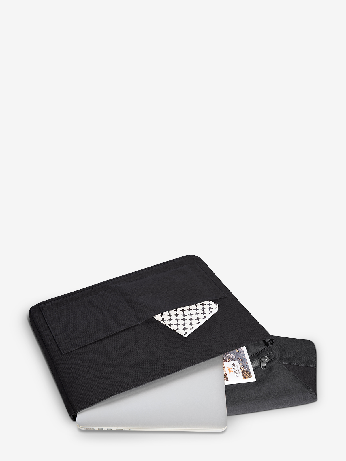 modern, elaborately crafted notebook sleeve; lovingly designed with coated cotton trim; suitable for notebooks and A4 documents; two flat insert pockets on the front; zipper compartment on the flap inside; large zipper compartment on the back; magnetic clasp