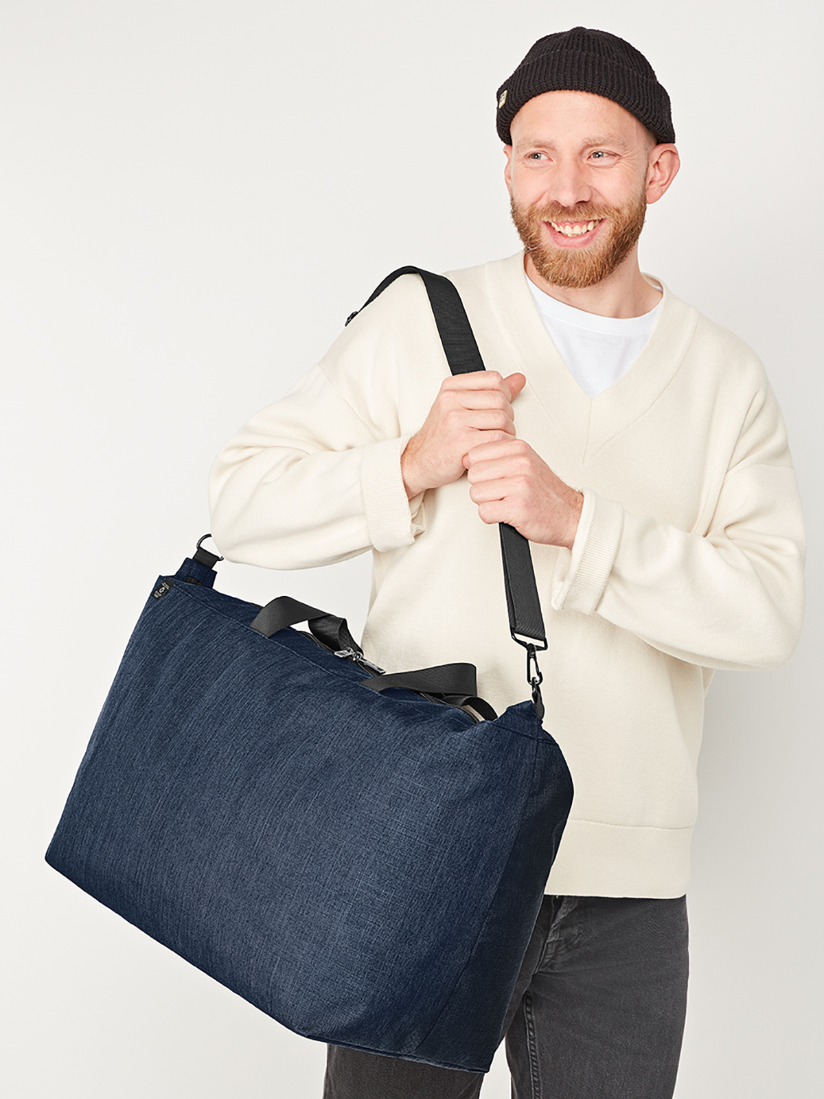 spacious main compartment with 2-way zip; solid base; rPET outer material; high-quality metal accessories; spacious, hanging inner pocket with zip; detachable, length-adjustable shoulder strap; handles