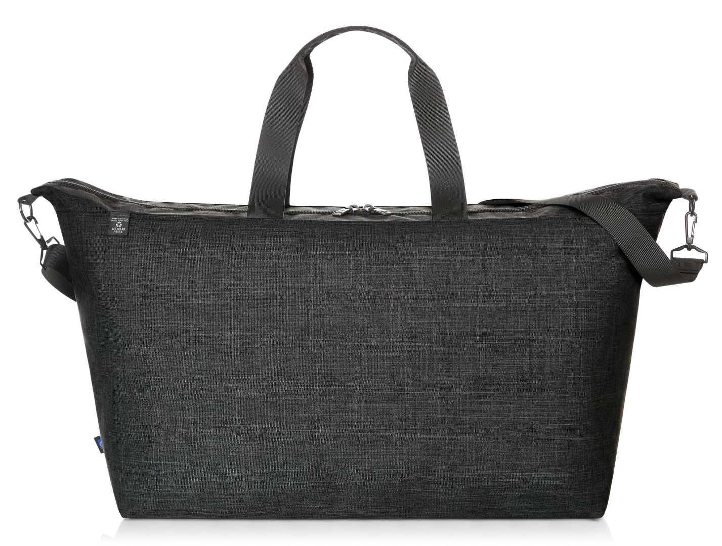 spacious main compartment with 2-way zip; solid base; rPET outer material; high-quality metal accessories; spacious, hanging inner pocket with zip; detachable, length-adjustable shoulder strap; handles