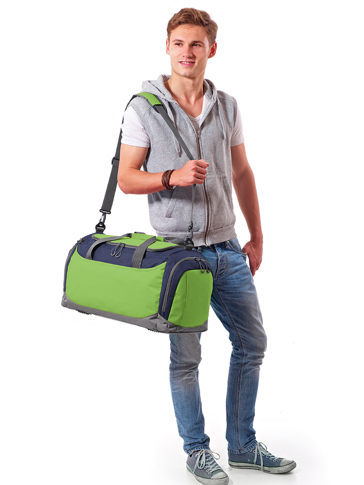 spacious main compartment with 2-way zipper; front pouch with flat zipper pocket; 2 lateral pockets, one of them with shoe compartment; removable, adjustable shoulder strap with comfortable shoulder pad; handle with hand cuff; bottom studs