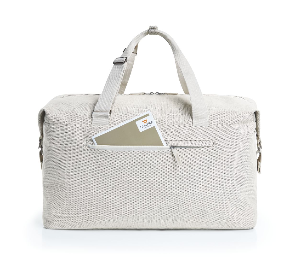 You can pack as much as you want into this roomy bag – it will always appear light and natural. The wonderful material makes sure of this; a soft but solid cotton-polyester mix. The bright sandy tone is truly fresh and pure. The strap, zips and the zipped pocket hanging inside come in a matching tone. Even the handles of the LOOM sport/travel bag can be adjusted in length. So they can be adjusted quickly to carry the bag over the shoulder or even wearing on your back. A long shoulder strap complements it all.