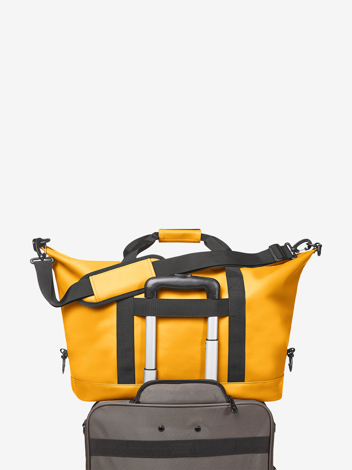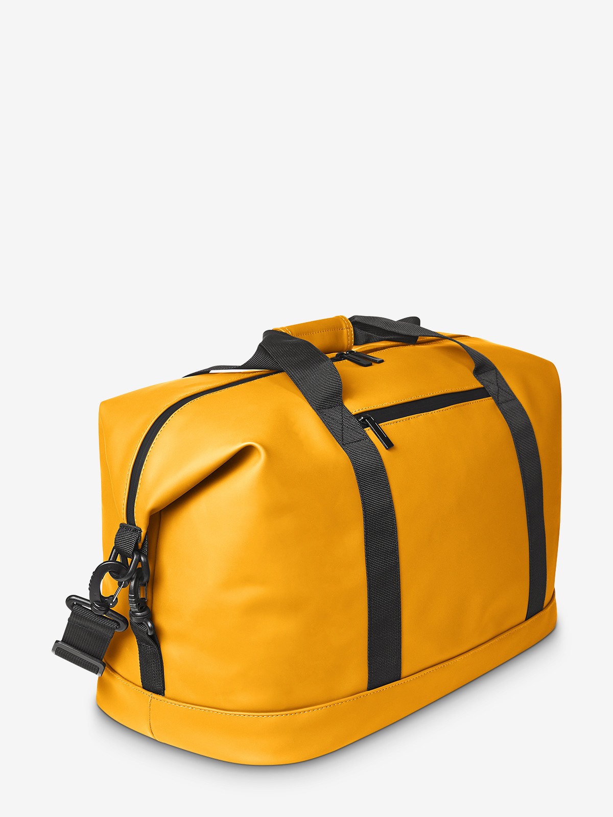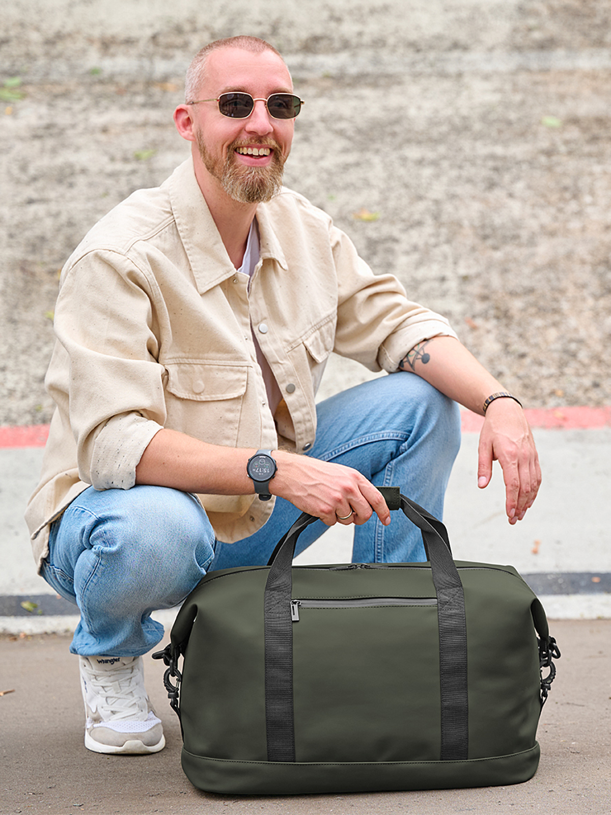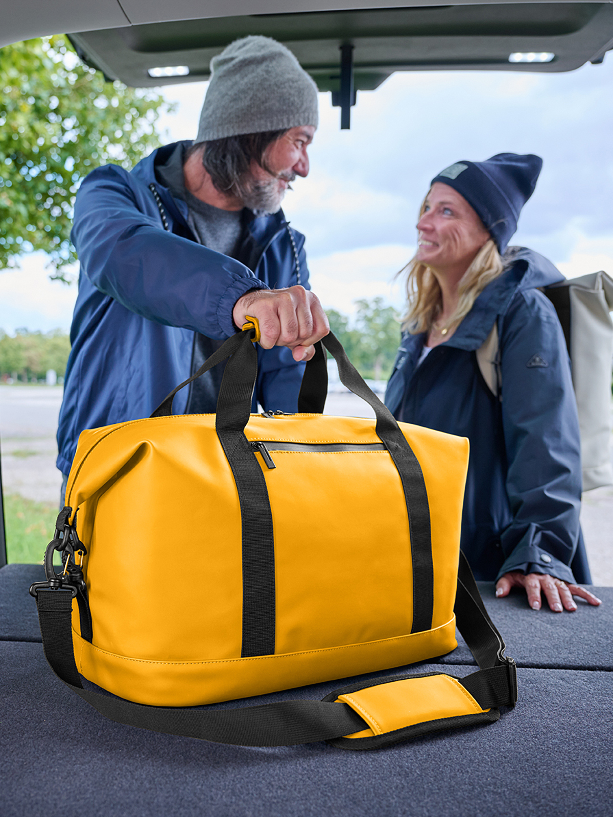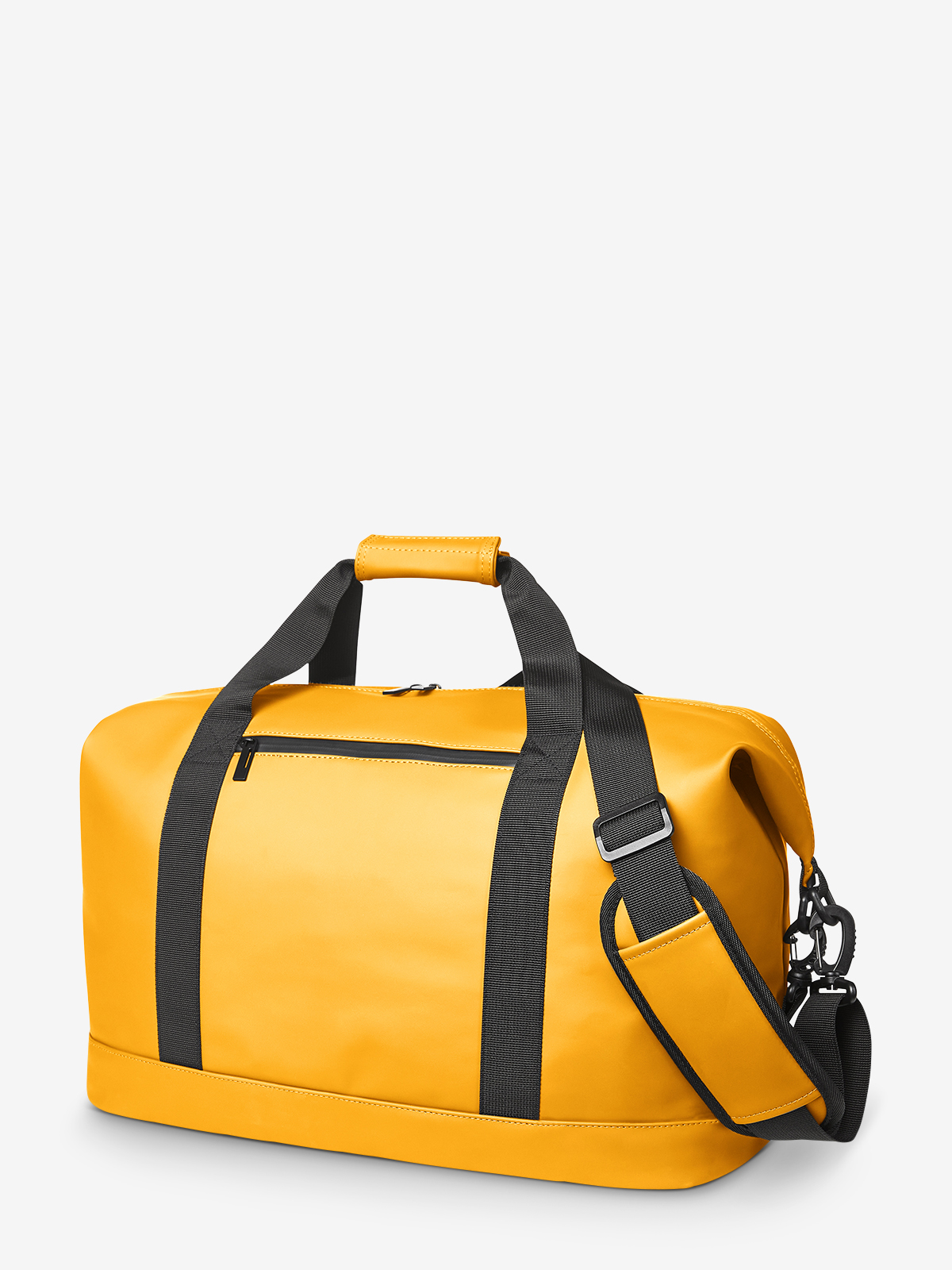 modern sports/travel bag; main compartment with water-repellent 2-way zipper; front pocket with water-repellent zipper; compression carabiner on the side for volume expansion; large zippered compartment inside; trolley attachment on the back; handles with padded grips; detachable, adjustable shoulder strap with sewn shoulder padding