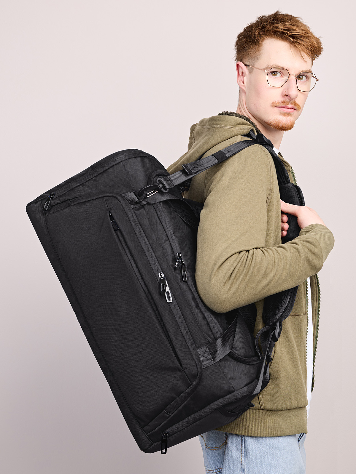 comfortable sports and travel bag with backpack function; recycled outer fabric; large main compartment with 2-way zipper opening; side zipper pocket including shoe bag; front: large front pocket with 2-way zipper opening plus flat zip pocket; inside: hanging zip organizer and spacious zip lid pocket; padded bottom; mesh side pocket for storing the adjustable, removable and padded shoulder straps – ergonomically shaped and usable either as backpack or shoulder strap; carrying handles with padded grip cuff