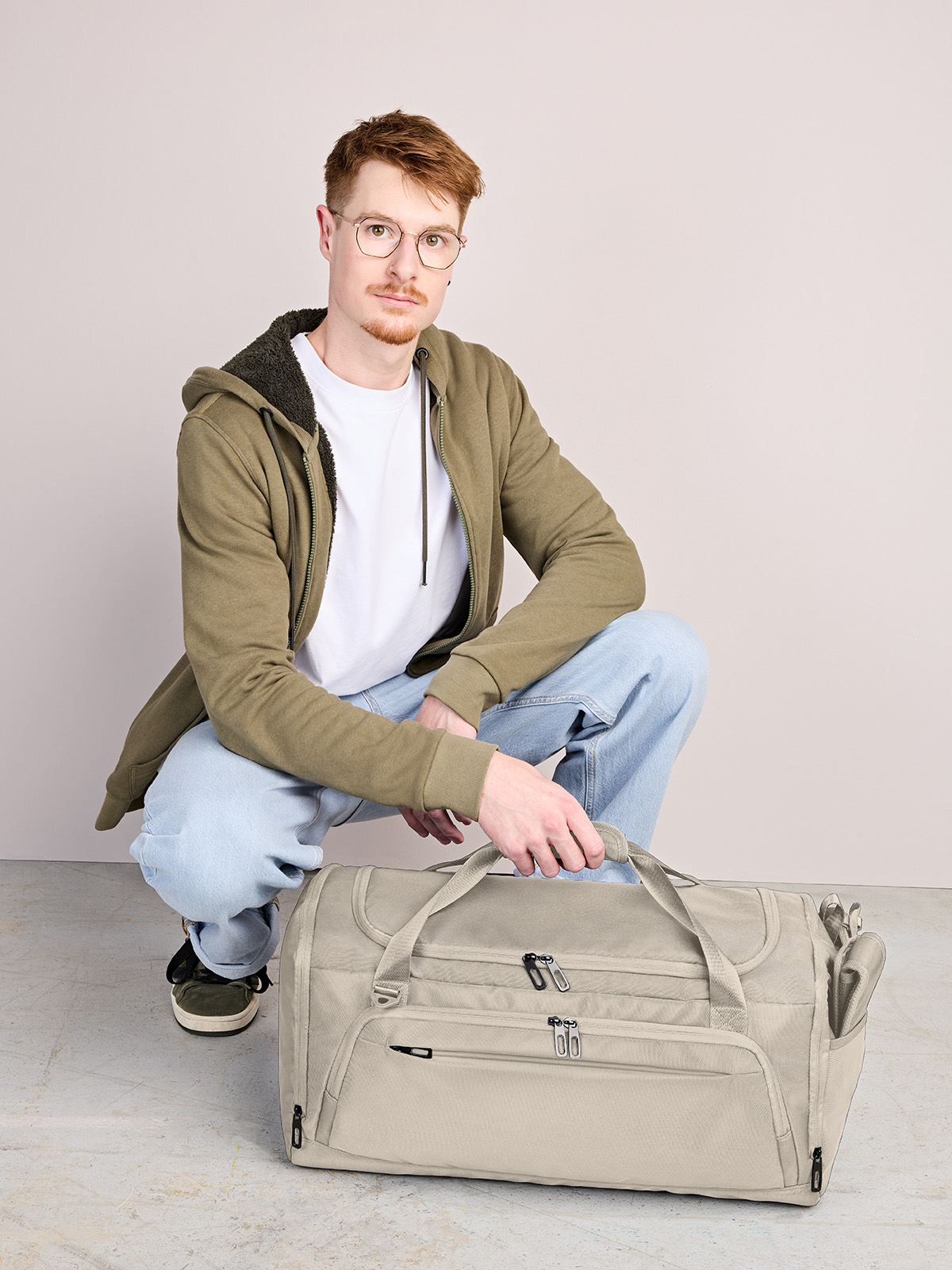 comfortable sports and travel bag with backpack function; recycled outer fabric; large main compartment with 2-way zipper opening; side zipper pocket including shoe bag; front: large front pocket with 2-way zipper opening plus flat zip pocket; inside: hanging zip organizer and spacious zip lid pocket; padded bottom; mesh side pocket for storing the adjustable, removable and padded shoulder straps – ergonomically shaped and usable either as backpack or shoulder strap; carrying handles with padded grip cuff