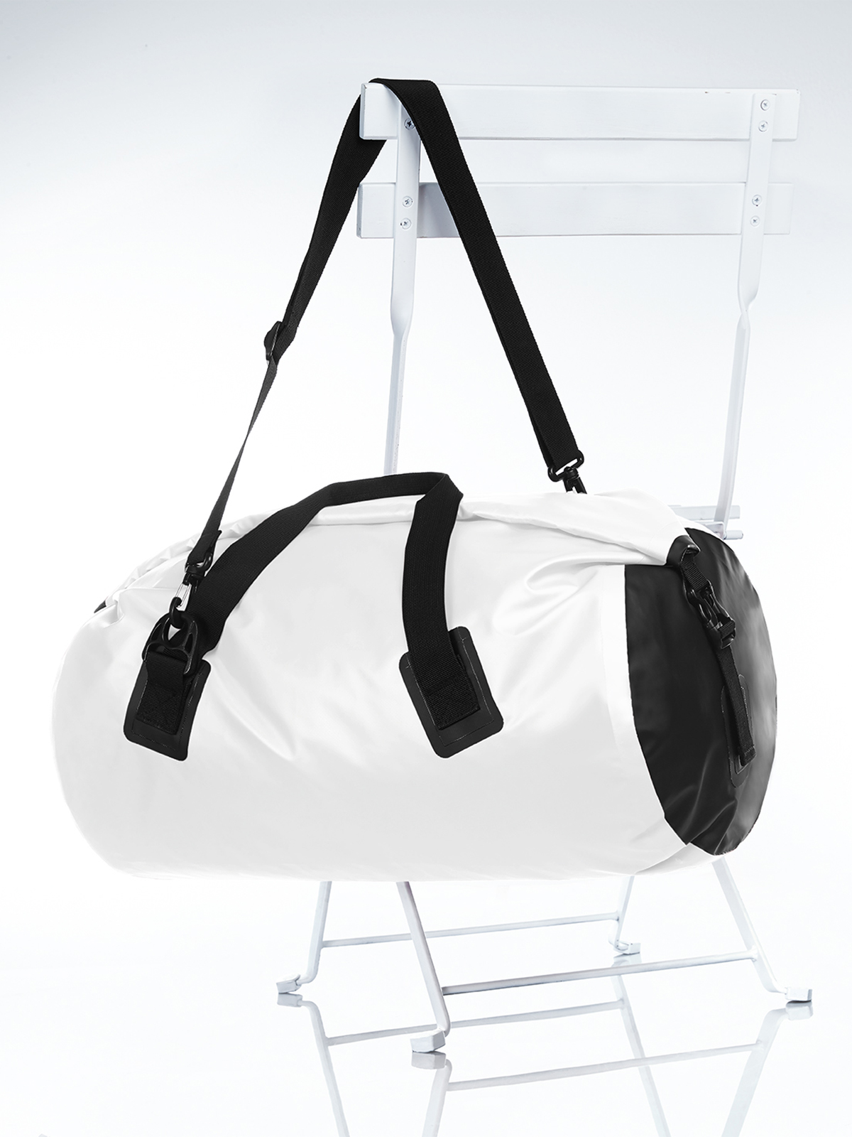 large main compartment with welds and roll closure protects the contents against water and dirt; lateral lashing straps; handles with padded grips; removable and length adjustable cross shoulder straps for optimal carrying comfort