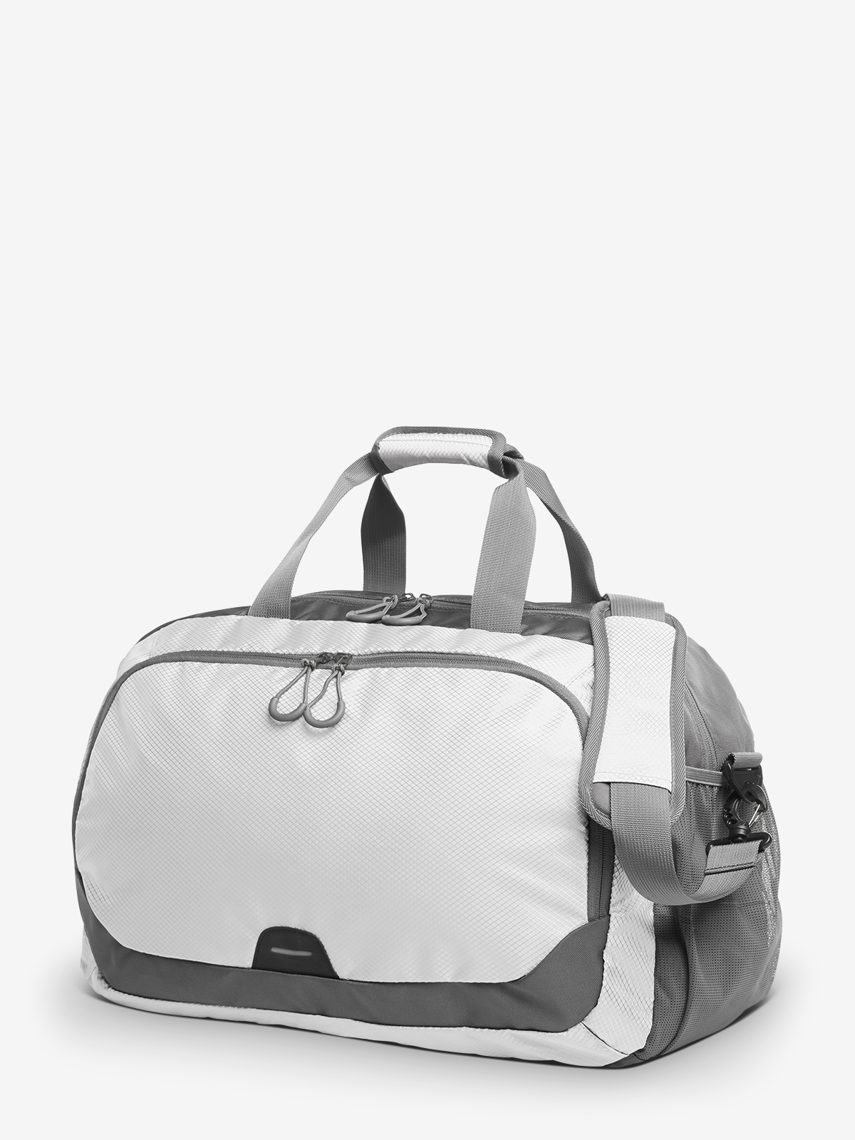 spacious zipper main compartment with organizer features and firm inside base; zipper front pocket with reflective element; lateral mesh pouches; lateral shoe compartment; handles with padded grips; removable, length-adjustable shoulder strap