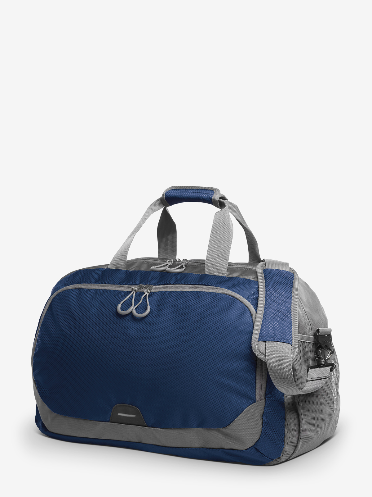 spacious zipper main compartment with organizer features and firm inside base; zipper front pocket with reflective element; lateral mesh pouches; lateral shoe compartment; handles with padded grips; removable, length-adjustable shoulder strap