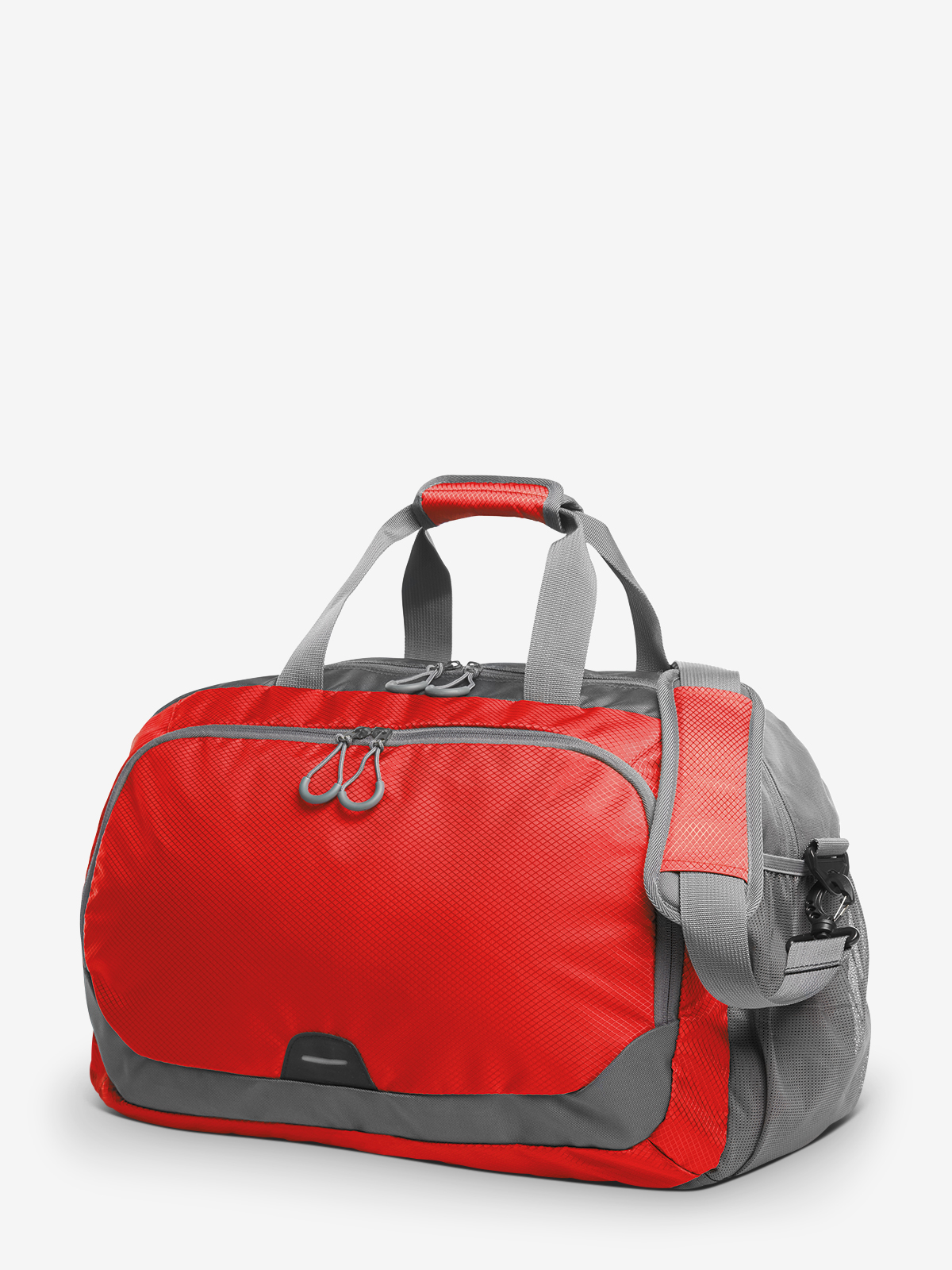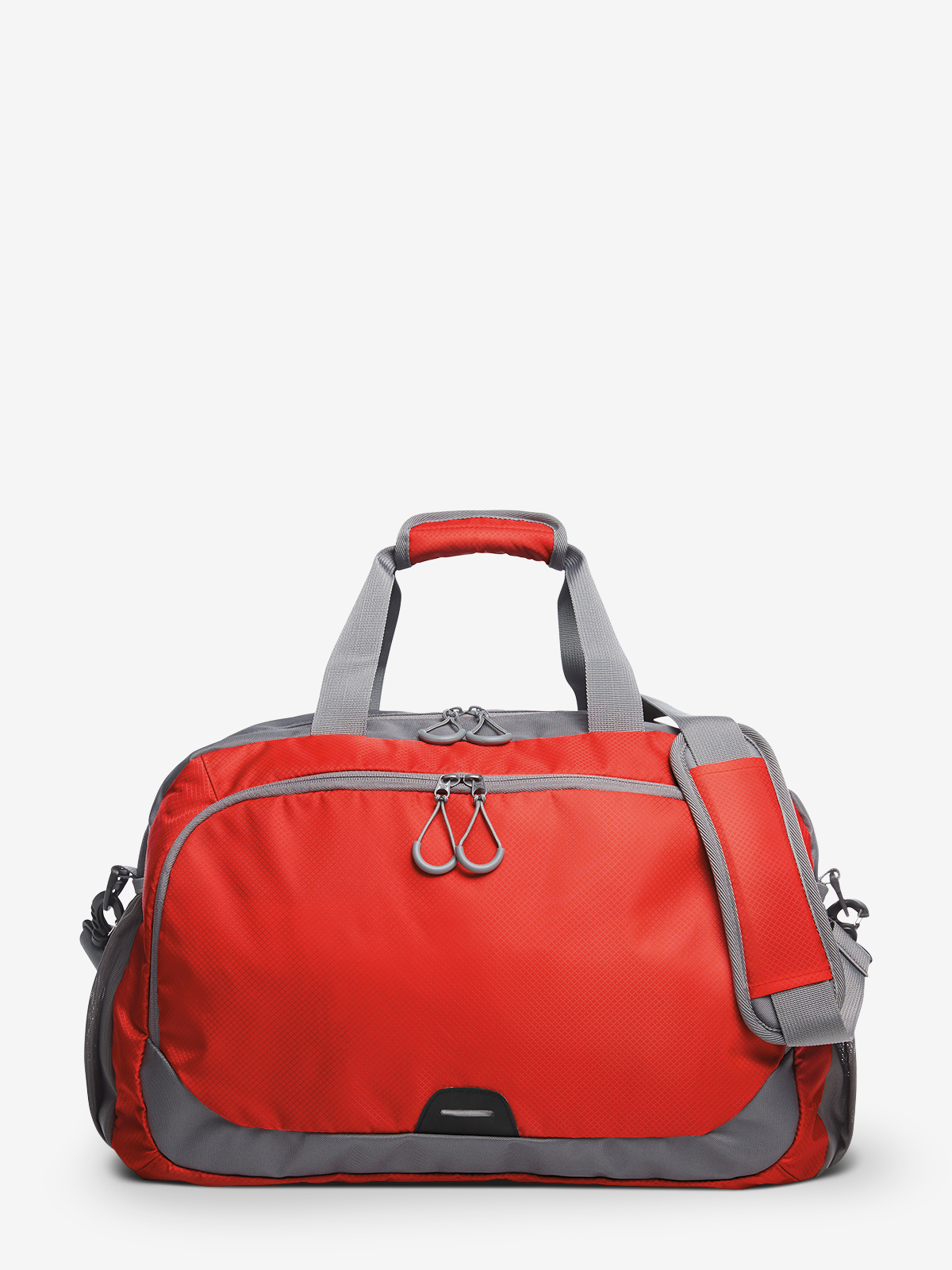 spacious zipper main compartment with organizer features and firm inside base; zipper front pocket with reflective element; lateral mesh pouches; lateral shoe compartment; handles with padded grips; removable, length-adjustable shoulder strap
