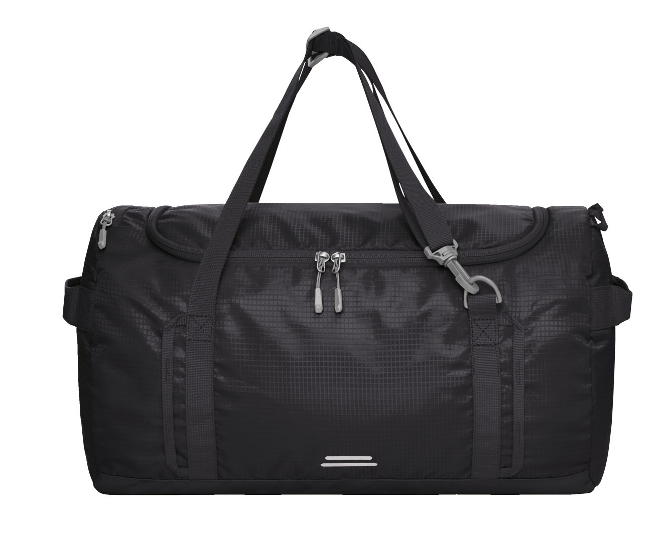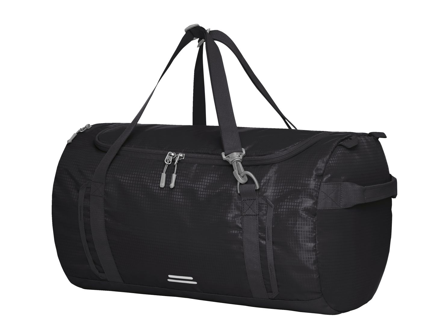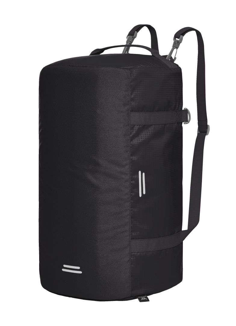 Lightweight, functional sports bag with backpack function; spacious main compartment; large opening with 2-way zip; zipped pocket in the lid; hanging as well as flat zipped pocket inside; zipped pocket on the side; functional strap band; handles on both sides; adjustable carrying handles can also be used as backpack straps; decorative reflective print