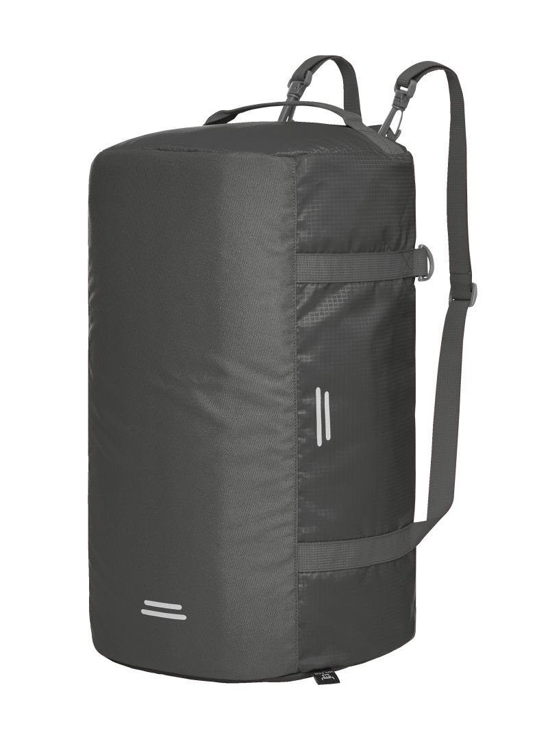Lightweight, functional sports bag with backpack function; spacious main compartment; large opening with 2-way zip; zipped pocket in the lid; hanging as well as flat zipped pocket inside; zipped pocket on the side; functional strap band; handles on both sides; adjustable carrying handles can also be used as backpack straps; decorative reflective print