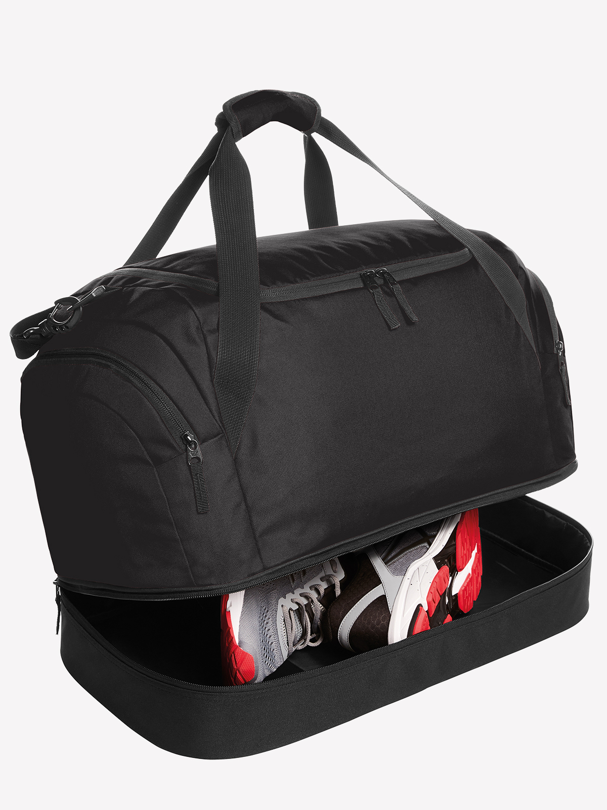 classic sports and leisure bag with sturdy bottom tray that can be filled separately; large main compartment with 2-way zipper; firm bottom with base feet; inner zipper compartment; two side pockets with zipper; carrying handles with handle cuff; removable, length-adjustable shoulder strap with shoulder padding