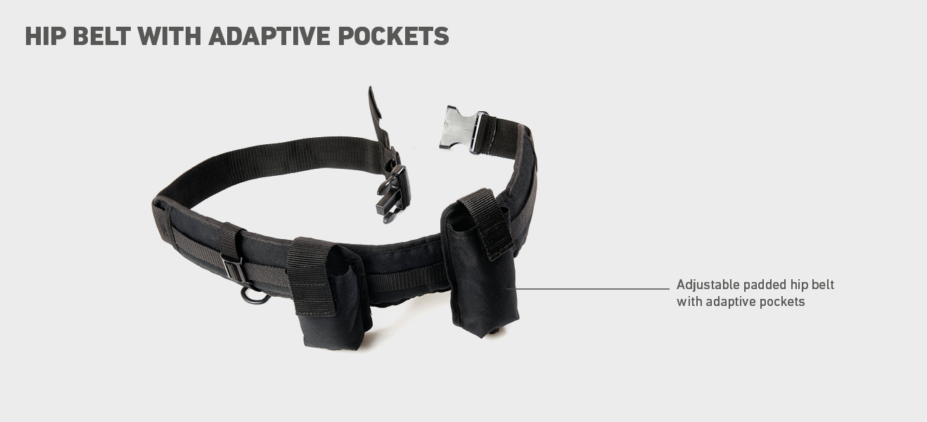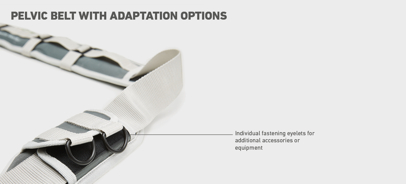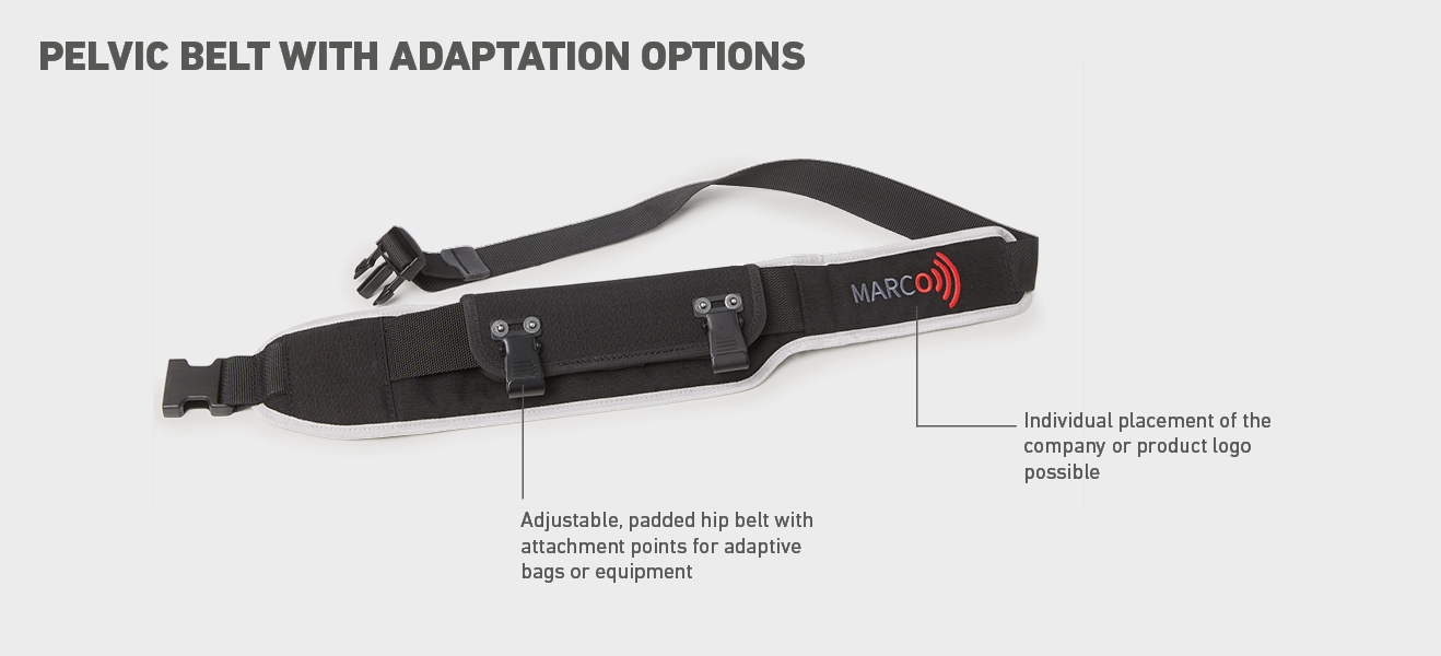 - Padded hip and pelvic belts for equipment and tools of all kinds, also with integrated pockets and special fasteners