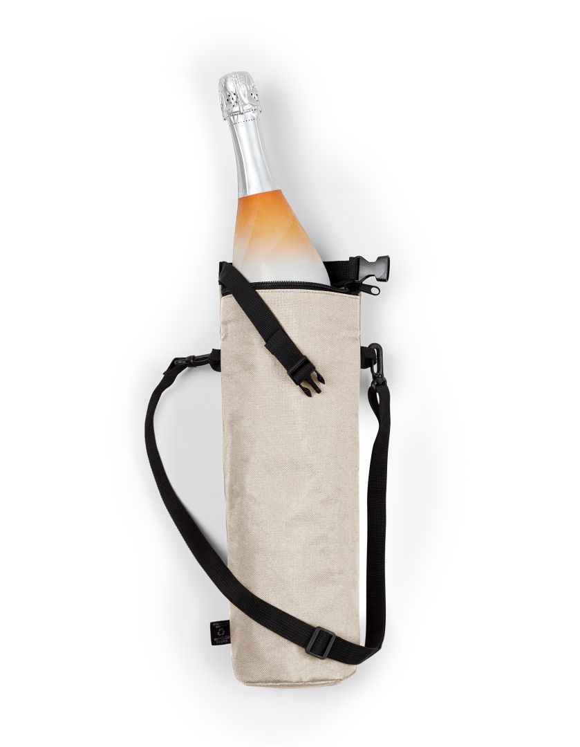 It is the guest gift par excellence, the number one present and always with you on outdoor activities: the bottle. If you want to give a bottle of champagne, a gift of home-made elderflower syrup or simply a bottle of cool water, the BOTTLE bag is the perfect choice. And it's so easy to carry as well, because it features a practical strap. In addition to this, the padded thermal bottle bag with recycled outer material has a roll-top zip and buckle. Thanks to the varied selection of colours, it adapts stylishly to situations, brands and events and could be seen at city fairs, festivals, fishing, camping, or at the next company party. By the way: even bulbous or longer 1-litre champagne or wine bottles fit in easily. You can reach a little higher on the shelf, because the price for the packaging with the BOTTLE Thermobag is surprisingly low.